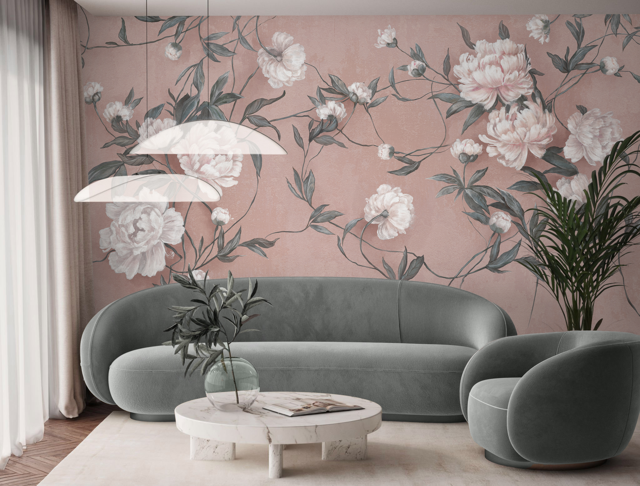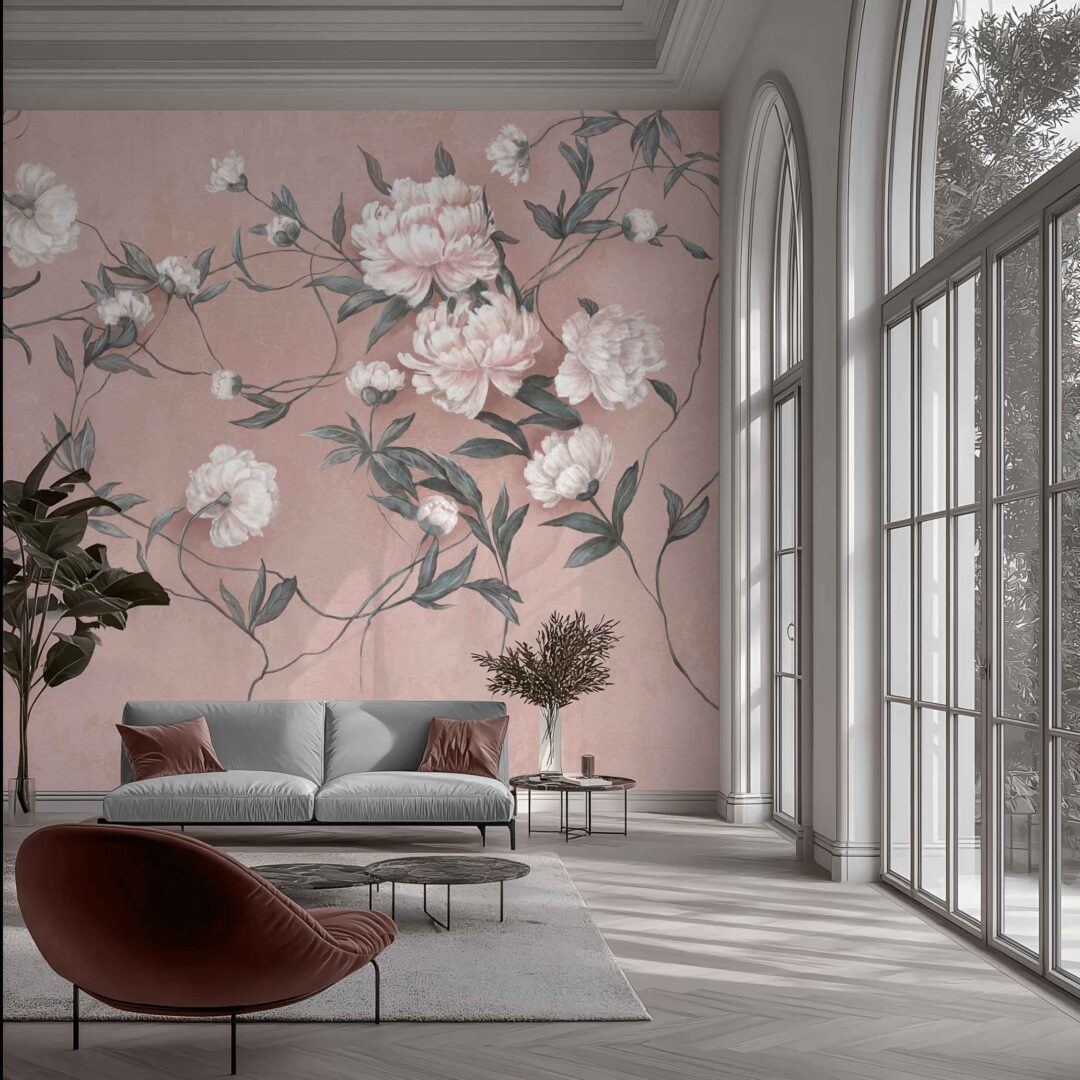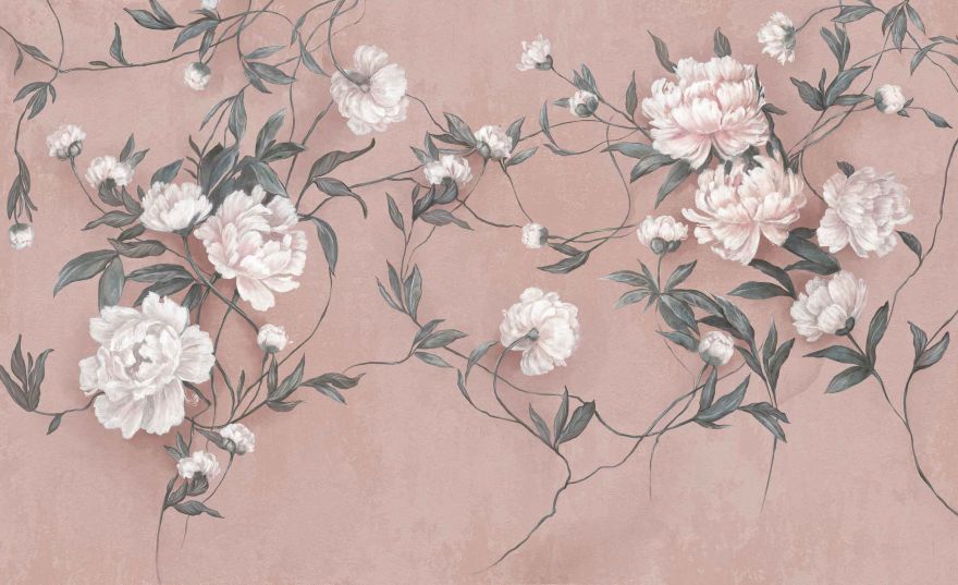 Tapeta Wall and More NIRA 25118 25C to florystyczny wzór z piwoniami i wijącymi się gałązkami, stworzony z myślą o wnętrzach, które mają być spokojne, przytulne i eleganckie jednocześnie. Kompozycja jest delikatna, ale ma wyraźny charakter, dlatego dobrze buduje klimat pomieszczenia bez wrażenia ciężkości. To wzór, który bardziej porządkuje przestrzeń, niż ją dominuje, a przy tym wnosi do niej miękkość i naturalny rytm.