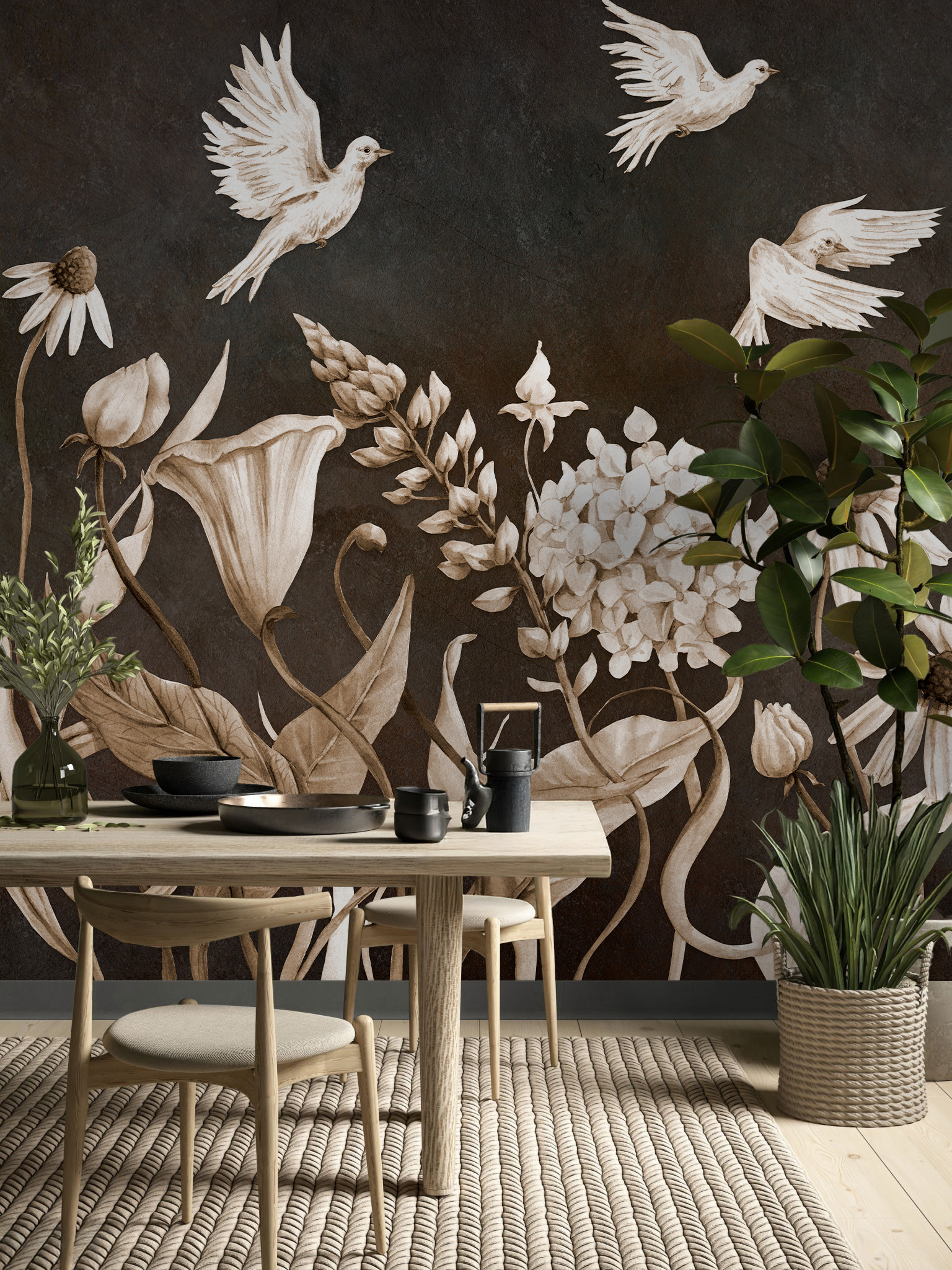 Tapeta Wall and More VERA – tapeta ścienna kwiaty i ptaki do spokojnych wnętrz