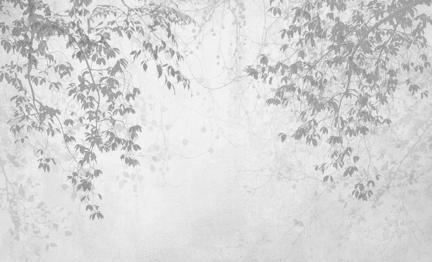 Na ścianie ten mural z liśćmi przypomina cień roślin widoczny za mlecznym papierem. Dzięki temu całość wygląda miękko, naturalnie i bardzo lekko. Wzór może być główną dekoracją ściany albo spokojnym tłem dla drewna, jasnych tkanin i prostych mebli.