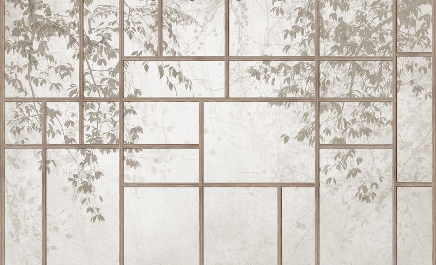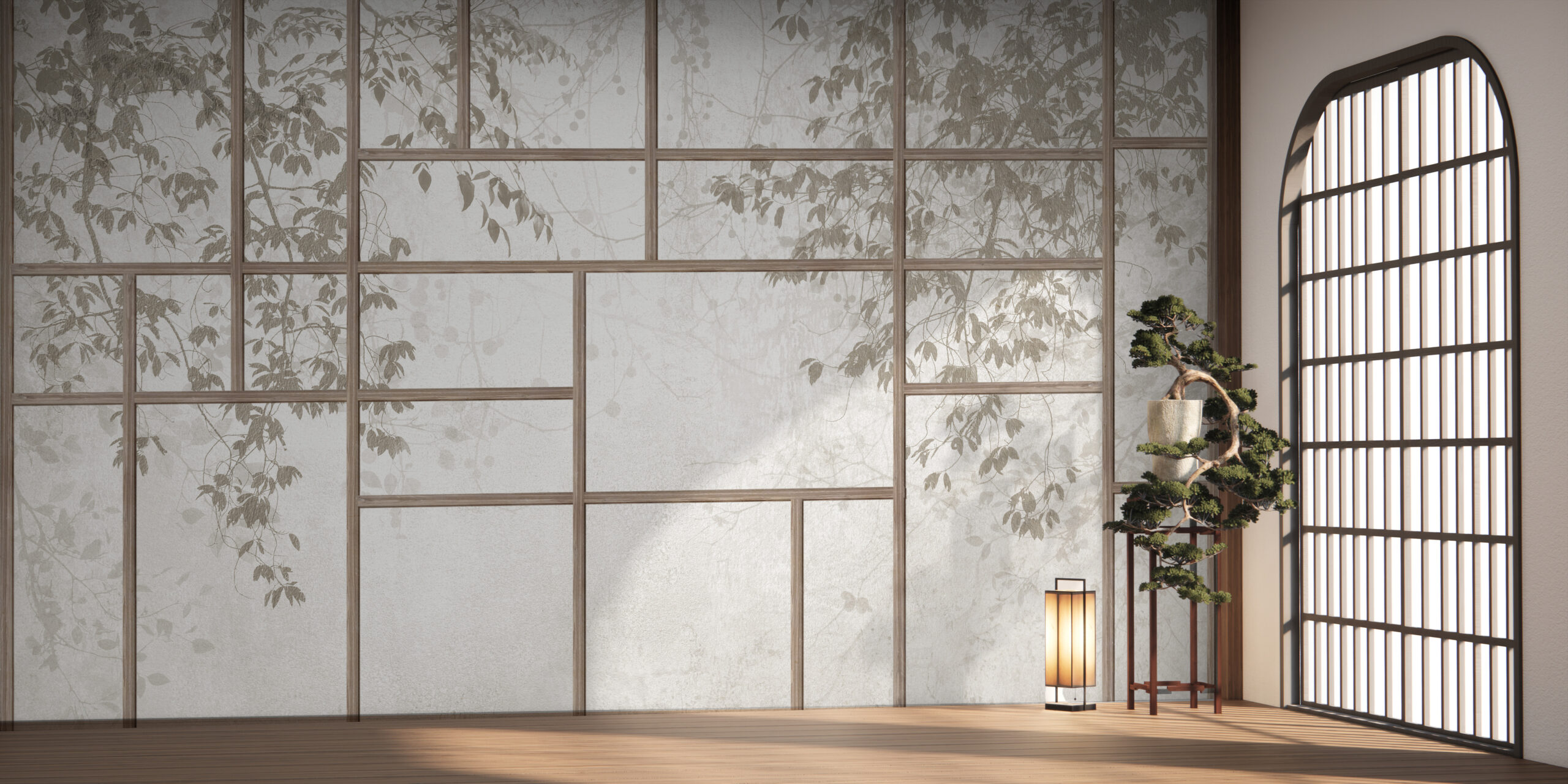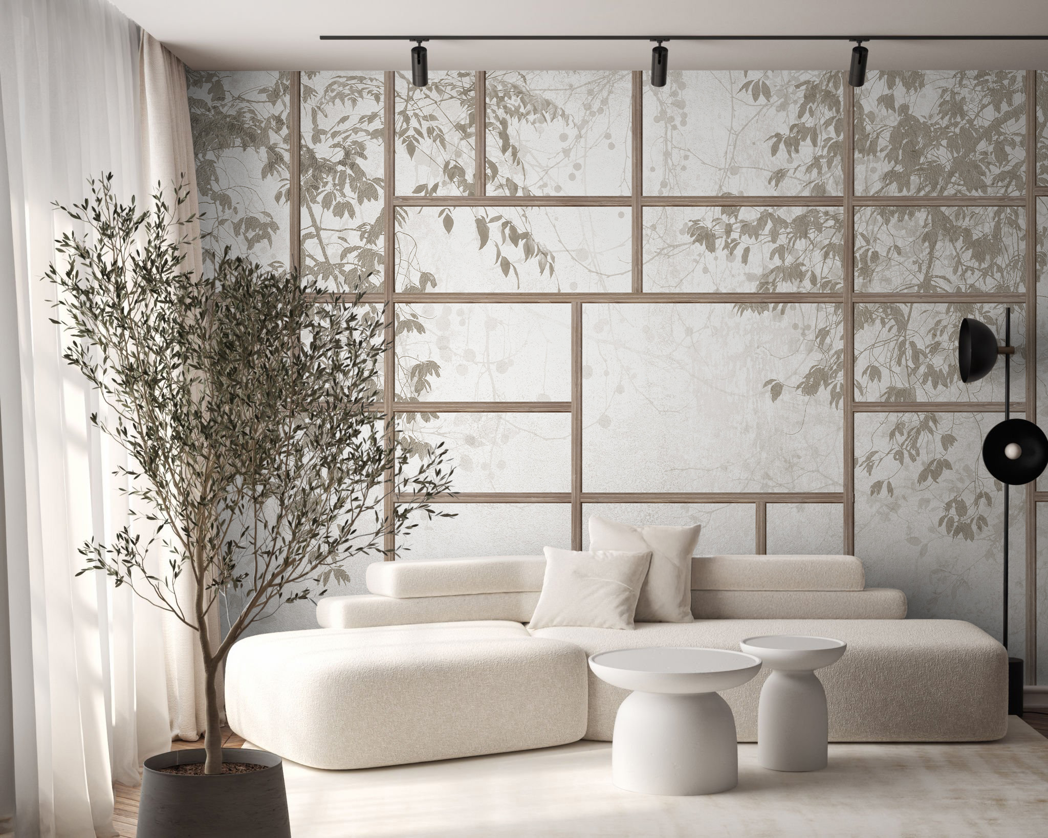 Tapeta Wall and More YUGEN 25133 21A opiera się na subtelnej grze między naturą a architekturą. Roślinny rysunek został zestawiony z geometrycznym układem inspirowanym panelami shoji, co daje spokojny, rytmiczny efekt na ścianie. Wzór wygląda delikatnie, ale nie jest nijaki. Porządkuje przestrzeń i sprawia, że wnętrze staje się lżejsze w odbiorze.