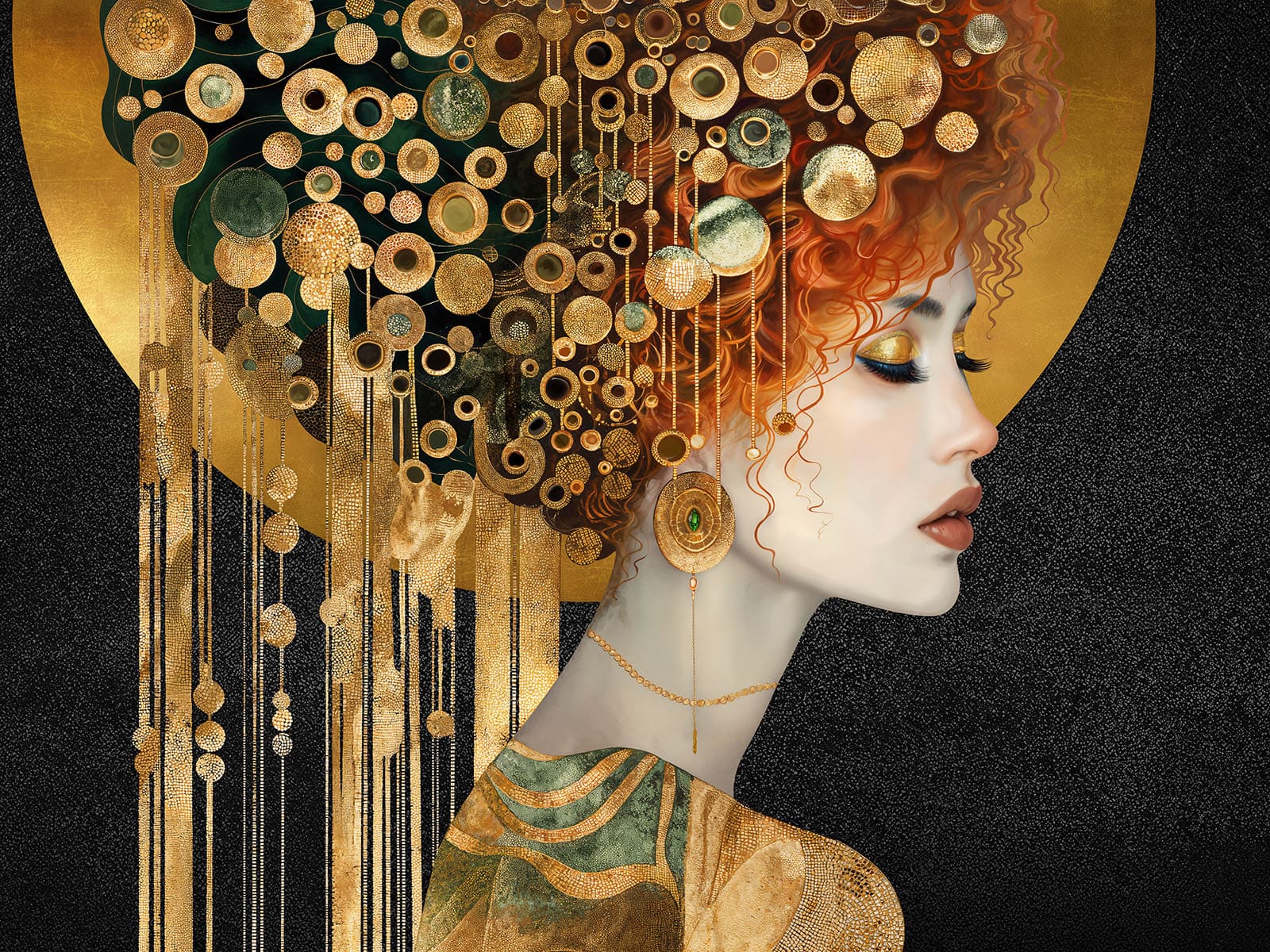 Centralnym punktem kompozycji jest kobiecy profil zwrócony w bok, otoczony kaskadą geometrycznych, złotych form układających się pionowo. Dekoracyjne okręgi i linie tworzą rytmiczną strukturę, która buduje głębię i dynamikę wzoru. Asymetryczny układ podkreśla nowoczesny i artystyczny charakter tapety.