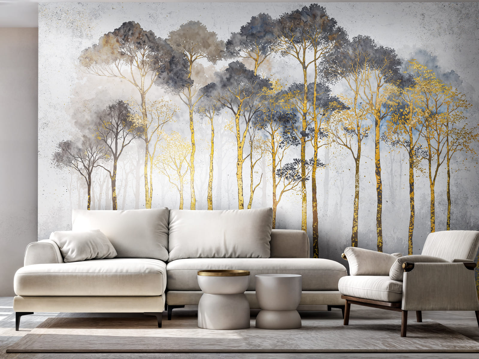 Tapeta z motywem lasu i złotymi drzewami na jasnym tle