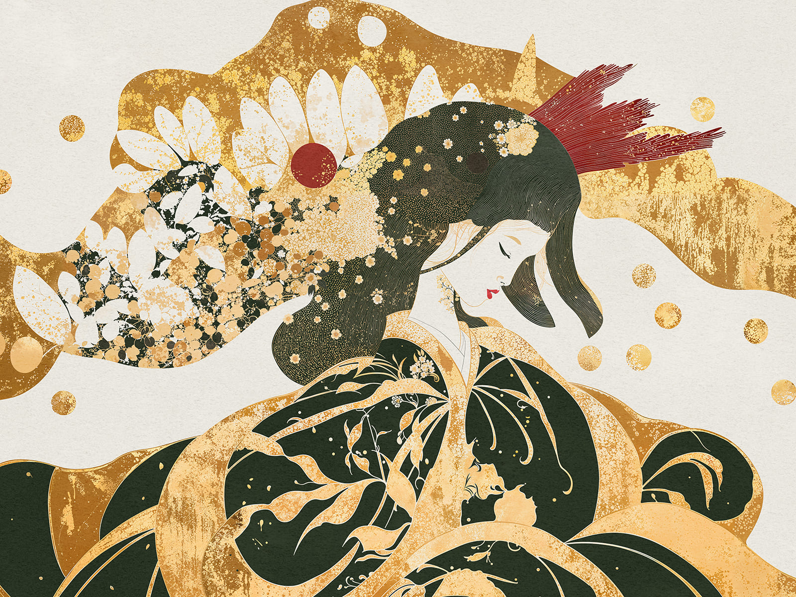Kompozycja oparta jest na połączeniu ciepłych odcieni złota, kremowej bieli, zieleni oraz akcentów czerwieni. Złote elementy nadają tapecie elegancki, luksusowy charakter, jednocześnie zachowując lekkość i artystyczną finezję. Tapeta świetnie sprawdzi się w salonie, sypialni, gabinecie, hotelowym lobby lub butikowym wnętrzu.