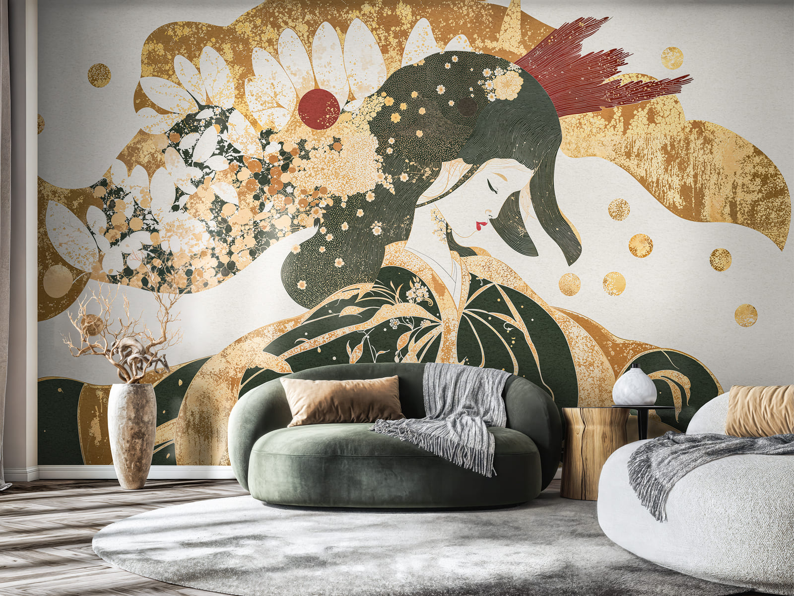 Sayumi 1075 31 2501 to tapeta ścienna inspirowana klasyczną sztuką Dalekiego Wschodu. Delikatna postać kobiety, miękkie linie oraz dekoracyjne tło pełne złotych detali i kwiatów budują spokojną, harmonijną atmosferę. Wzór doskonale łączy nowoczesną ilustrację z tradycyjną estetyką orientalną.