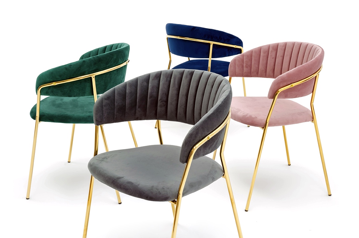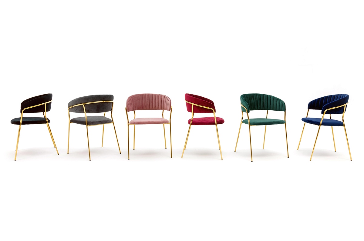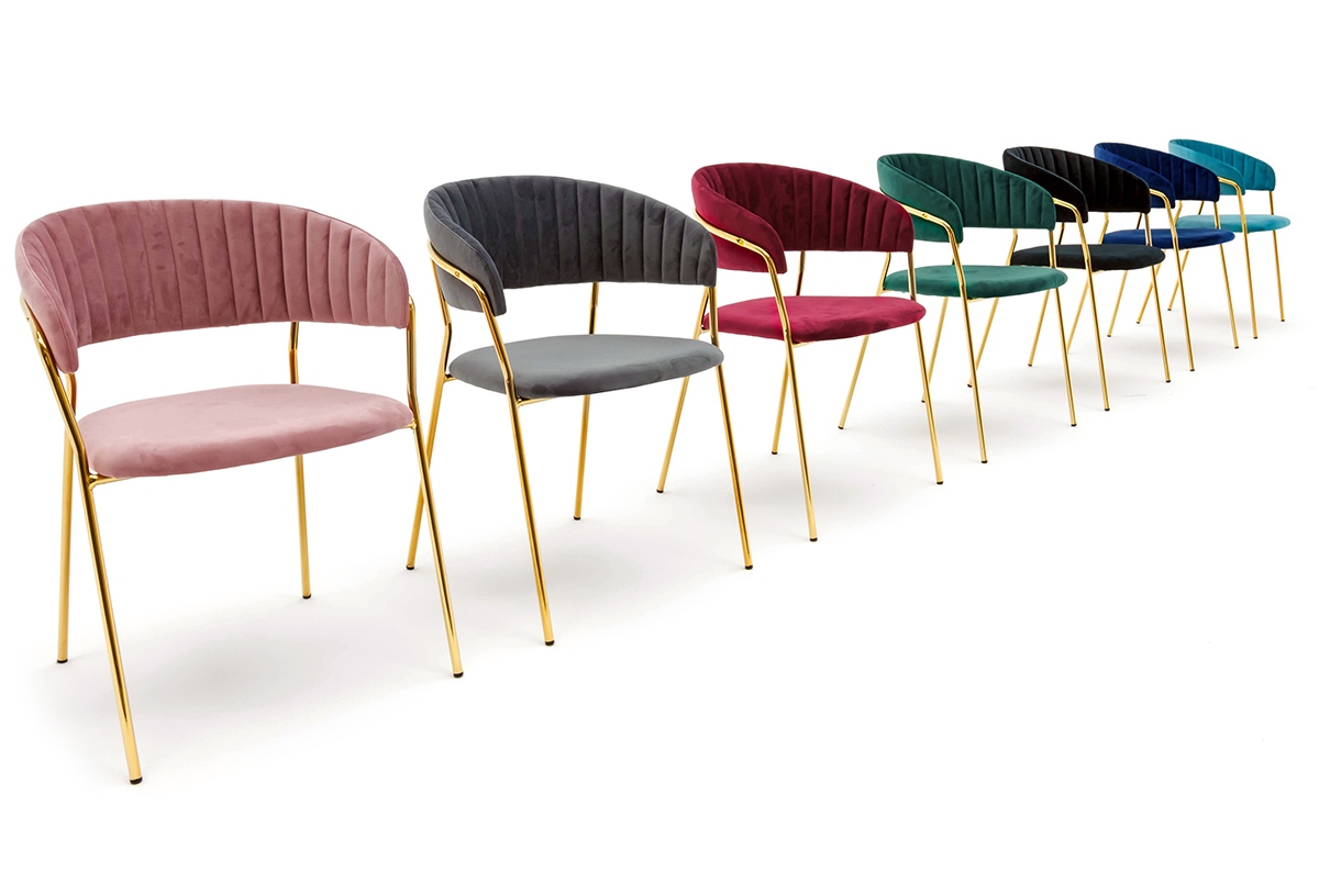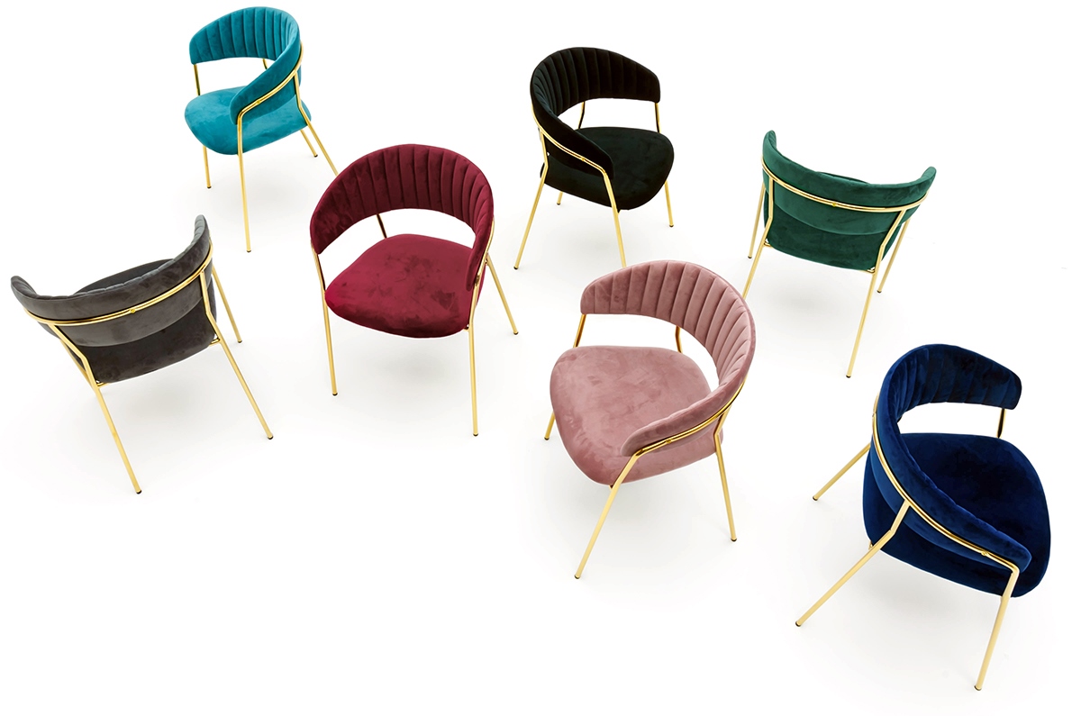 Miękkie siedzisko oraz oparcie pokryte aksamitnym welurem zapewniają wyjątkowy komfort i przyciągają uwagę subtelnym blaskiem.