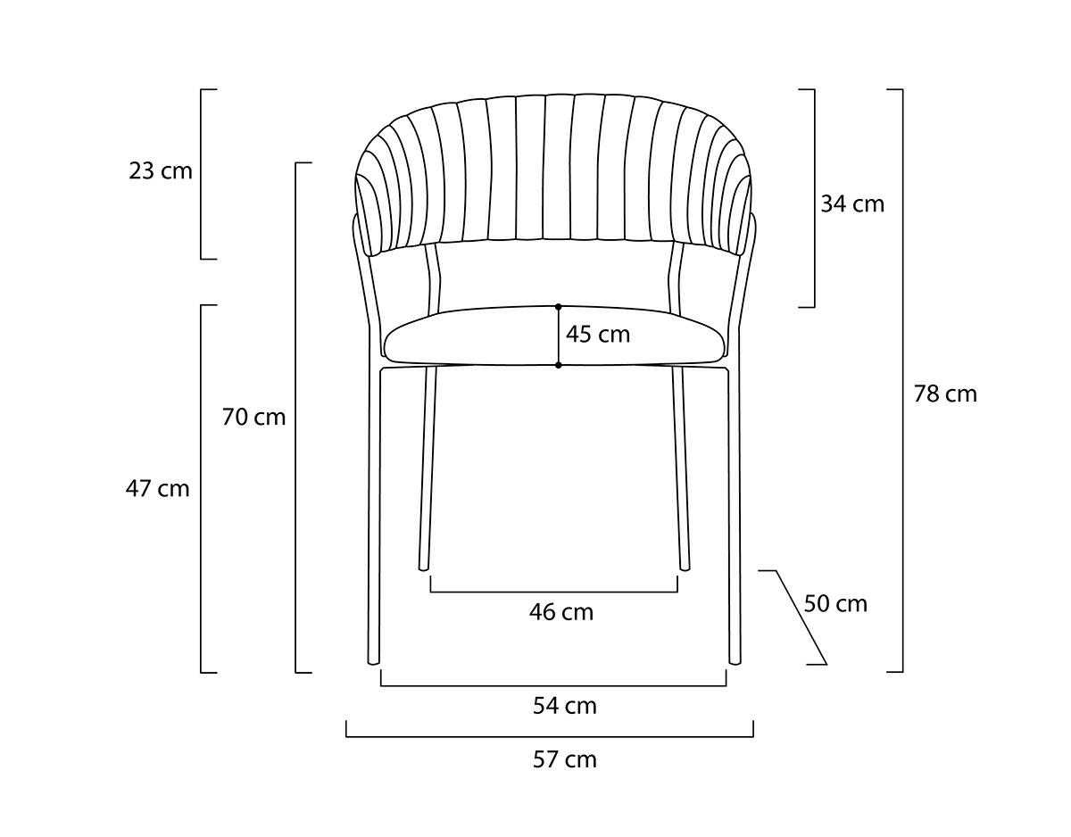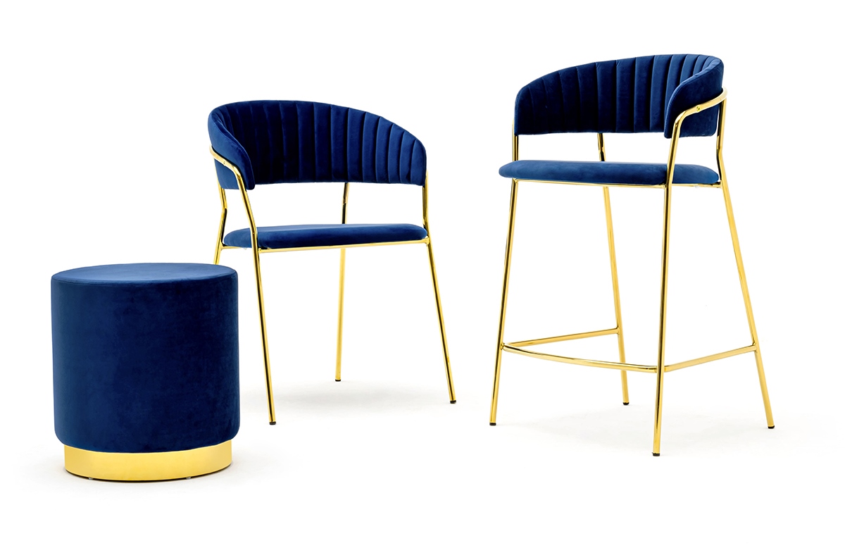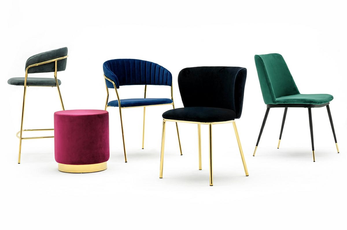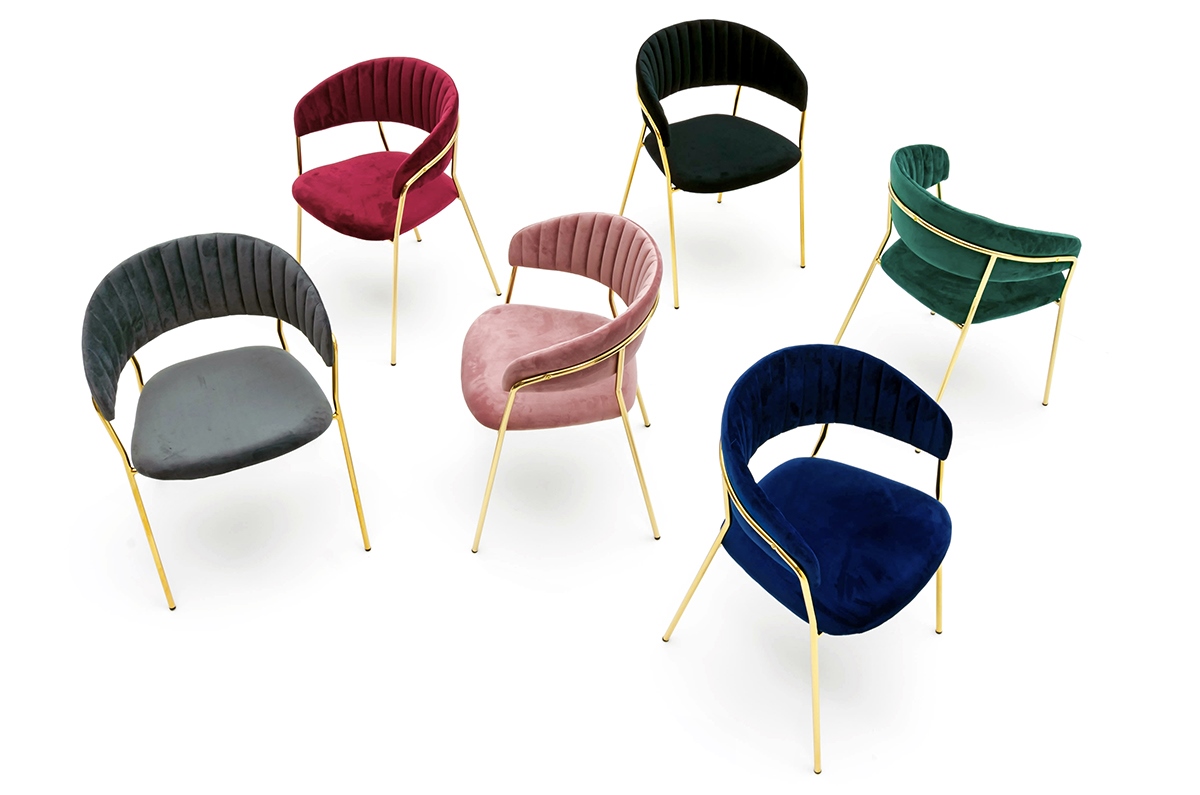Miękkie siedzisko oraz oparcie pokryte aksamitnym welurem zapewniają wyjątkowy komfort i przyciągają uwagę subtelnym blaskiem.