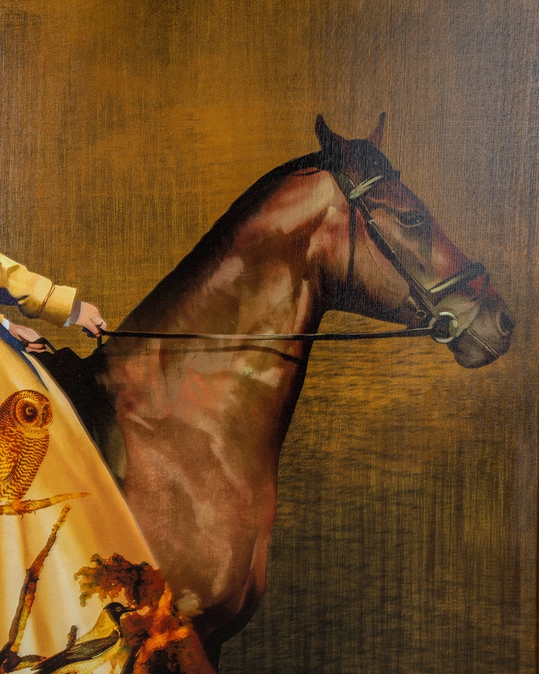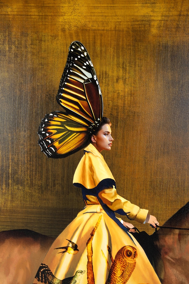 Kobieta siedząca na koniu ma nakrycie głowy przypomina pięknego motyla., co dodaje całej kompozycji majestatyczności i szlachetności.