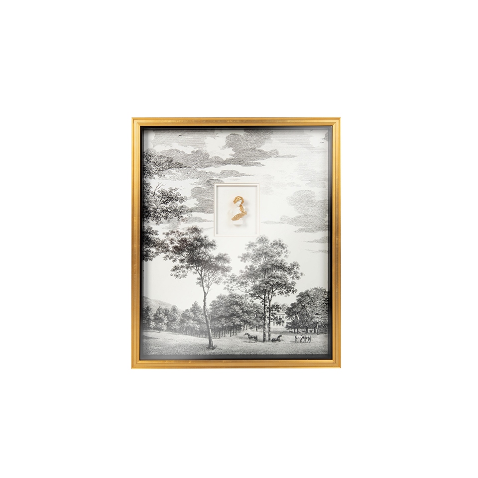 Elegancka i nowoczesna grafika, wykonana w stonowanej kolorystyce i oprawiona w stylową złotą ramę.