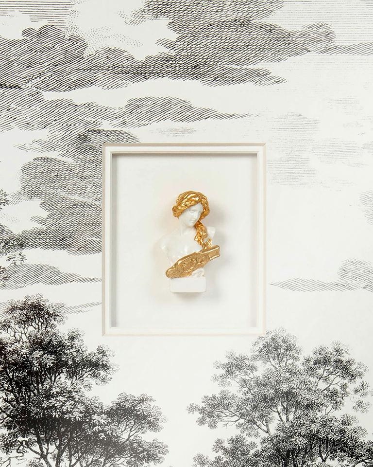 W centrum kompozycji umieszczono rzeźbę kobiety ze złotym akcentem, która dodaje nowoczesnego charakteru i przyciąga uwagę.