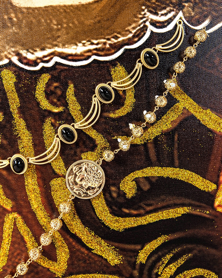 Biżuteria w tym okrągłe kolczyki oraz łańcuszek zostały wyróżnione prawdziwymi elementami ze stali nierdzewnej.