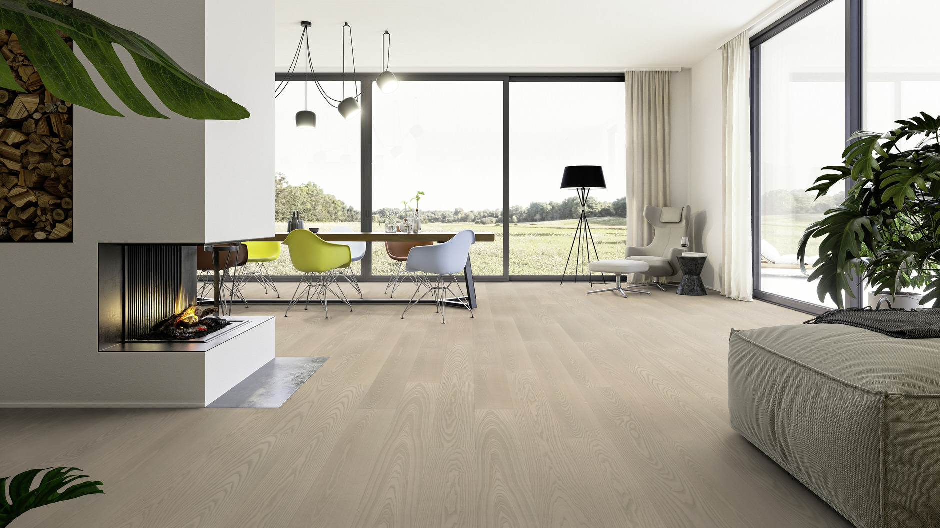 Ta deska podłogowa jesionowa ma wymiar 2197 x 205 x 11 mm. Format 205 mm szerokości zapewnia proporcjonalny, nowoczesny efekt bez nadmiernego poszerzania wizualnego przestrzeni. 4-stronna mikrofaza wyraźnie oddziela każdą deskę i podkreśla układ podłogi.