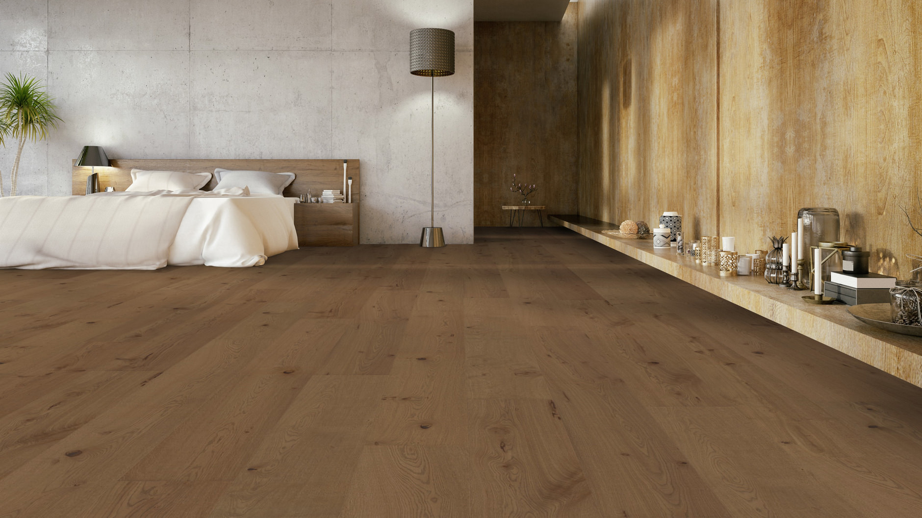 Naturalny rysunek drewna z widocznymi sękami nadaje podłodze autentyczny wygląd. Szczotkowanie uwydatnia strukturę słojów, dzięki czemu powierzchnia jest wyczuwalna pod dłonią. Wykończenie Nature Protec OLIO chroni drewno, zachowując efekt extra matowy.