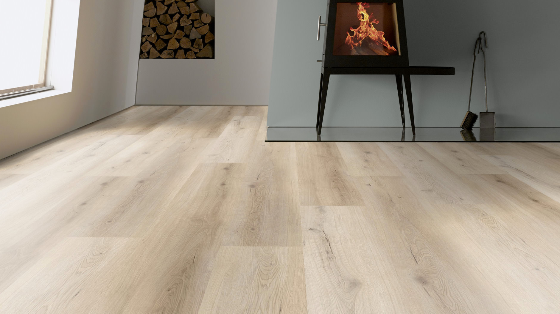 Dąb Tokyo marki ter Hürne to podłoga winylowa w formacie długiej deski, z dekorem drewna w jasnym, lekko rozbielonym odcieniu. Na aranżacjach widać spokojny rysunek słojów, delikatne sęki i subtelne pęknięcia dekoracyjne, dzięki czemu podłoga wygląda naturalnie, ale nie przytłacza wnętrza. Taki model dobrze sprawdza się w nowoczesnych, jasnych przestrzeniach, gdzie ważna jest lekka kolorystyka i spójna baza do dalszej aranżacji. Format długiej deski dobrze prezentuje się na większych powierzchniach i pomaga uzyskać bardziej uporządkowany układ podłogi. Szczotkowana powierzchnia lepiej pokazuje strukturę drewna, a wykończenie extra matowe ogranicza odbicia światła. 4-stronna mikrofaza podkreśla krawędzie każdej deski i wzmacnia efekt pojedynczych elementów. To model do zastosowań domowych i komercyjnych, z parametrami dopasowanymi do codziennego użytkowania.