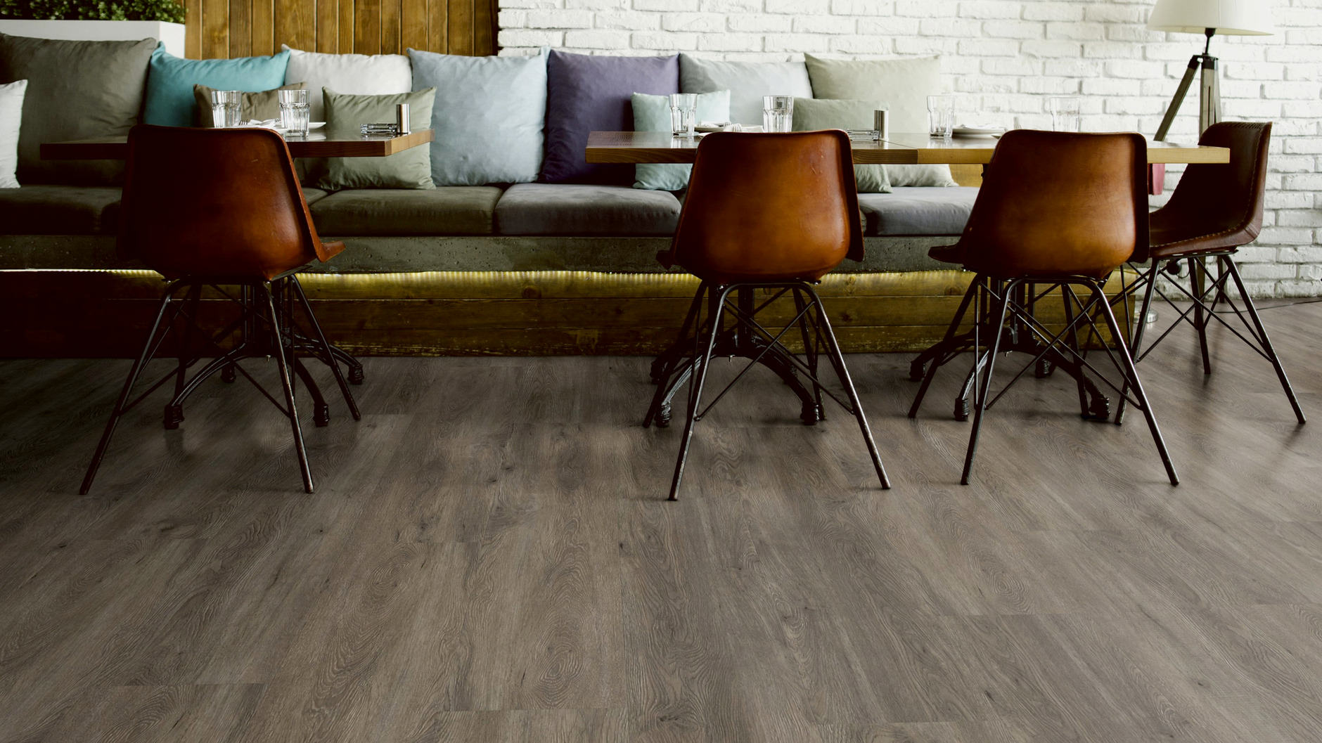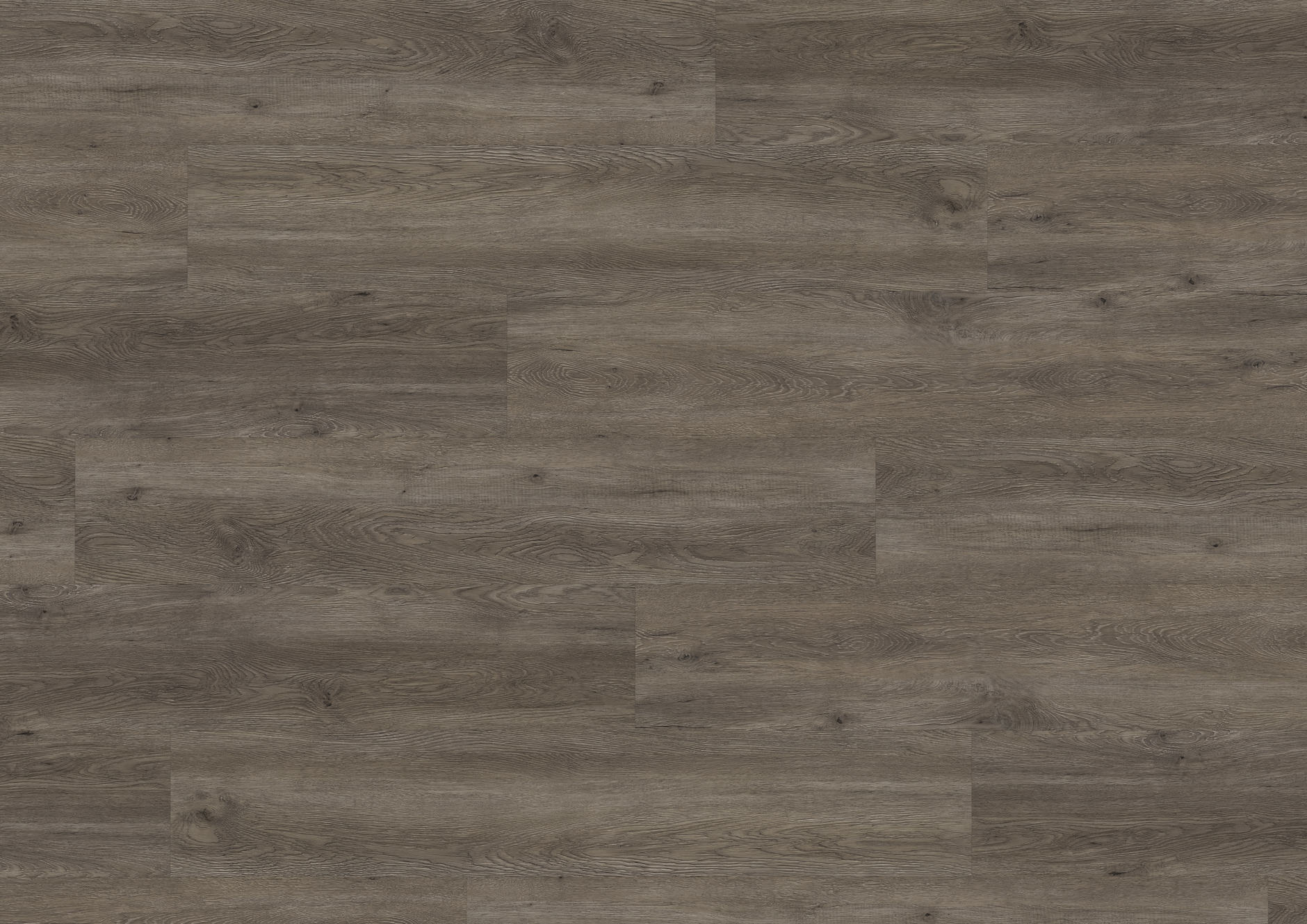 Dąb Canberra to panele winylowe w formacie klasycznej deski, z dekorem ciemnego dębu i wyraźnym usłojeniem. Powierzchnia jest matowa, głęboko porowata i synchroniczna, dzięki czemu rysunek drewna wygląda spójnie z fakturą. 4-stronna mikrofaza podkreśla podział na pojedyncze deski i porządkuje układ podłogi na większej powierzchni.