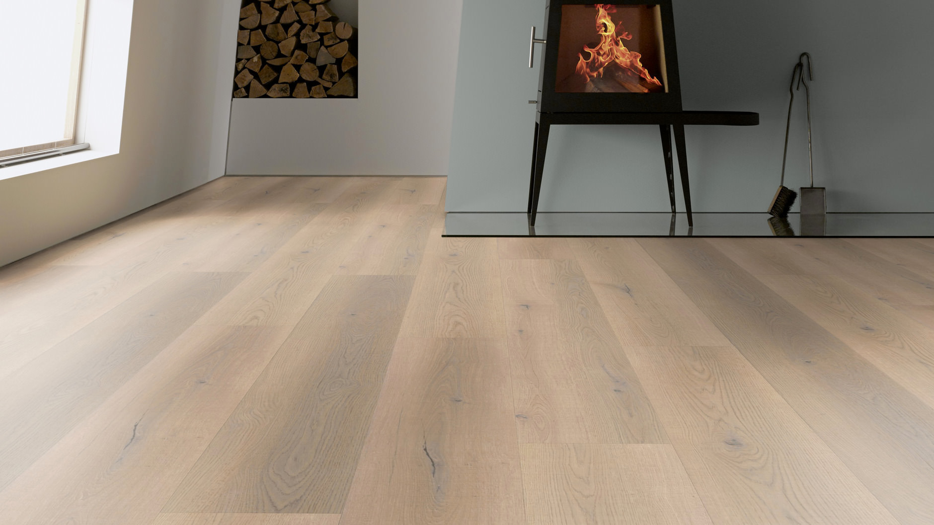 Struktura synchron oznacza dopasowanie tłoczenia do rysunku drewna. Powierzchnia szczotkowana podkreśla usłojenie i daje wyczuwalną strukturę pod stopą. Extra matowa powłoka ogranicza refleksy i sprawdza się w jasnych wnętrzach.