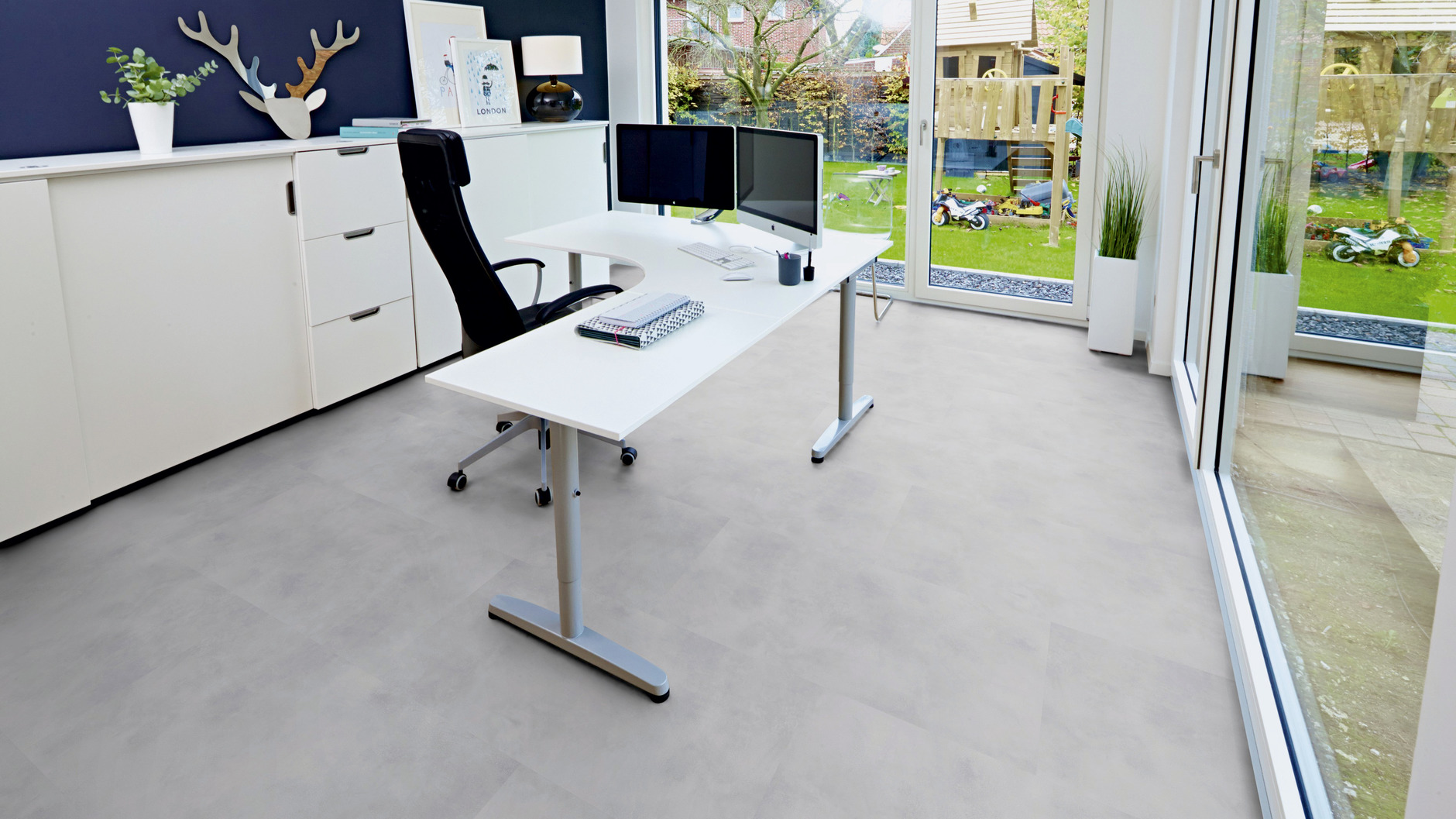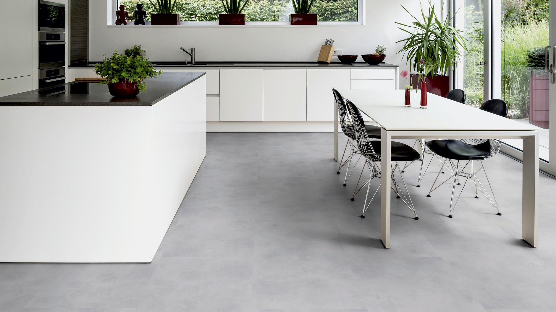 Jasna podłoga w odcieniu chłodnego betonu z delikatnymi przejściami tonalnymi. Powierzchnia jest spokojna, lekko zróżnicowana, bez wyraźnych kontrastów, co daje jednolity efekt na większej powierzchni. Struktura typu miniperl oraz matowe wykończenie ograniczają odbicia światła i podkreślają surowy charakter dekoru.
