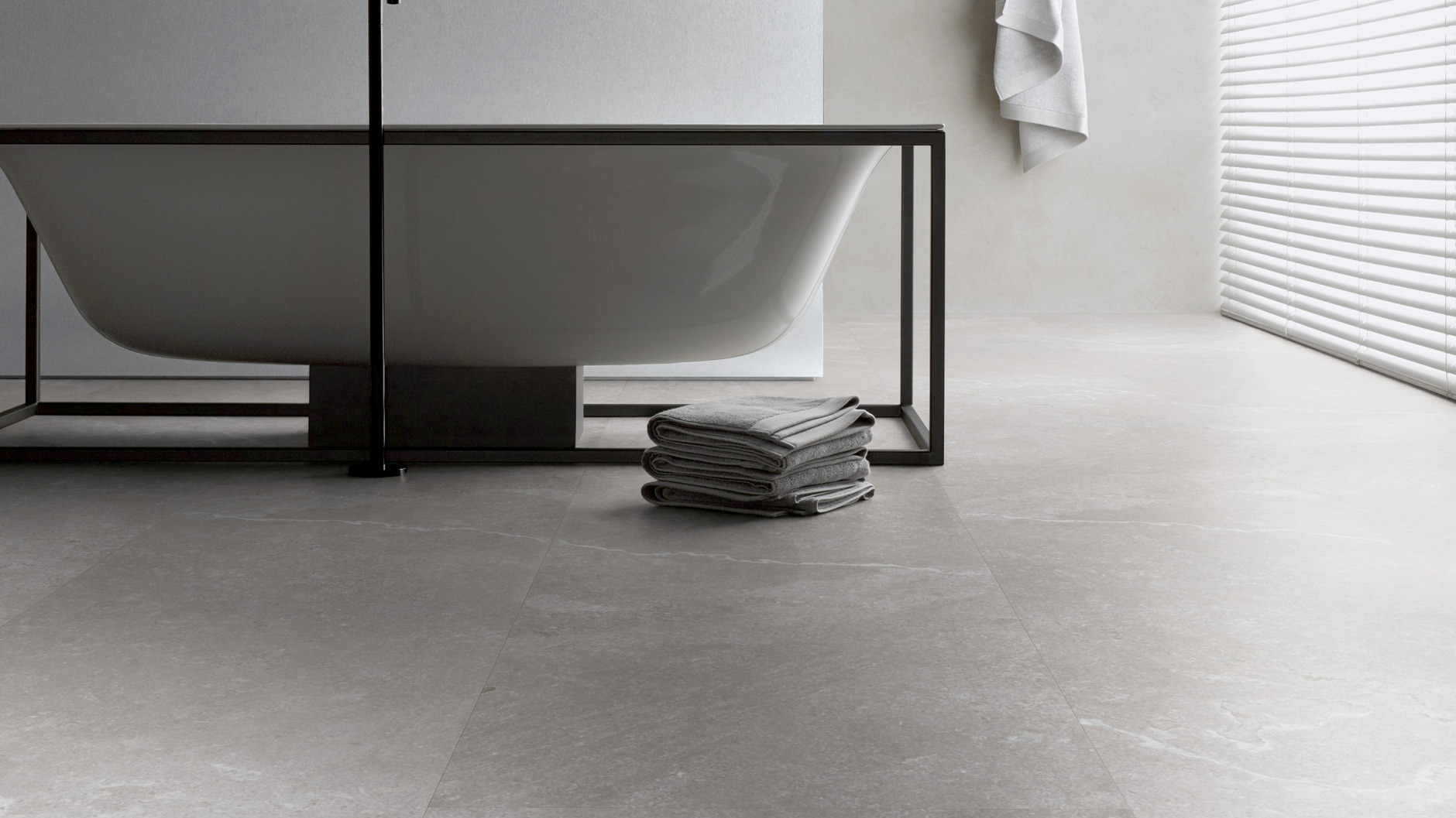 Jasnoszary dekor inspirowany naturalnym kamieniem z delikatnymi żyłowaniami widocznymi na powierzchni. Struktura jest subtelna, lekko wyczuwalna pod ręką, a matowe wykończenie eliminuje odbicia światła. Duży format płyt ogranicza podziały, dzięki czemu całość wygląda spokojnie i jednolicie.