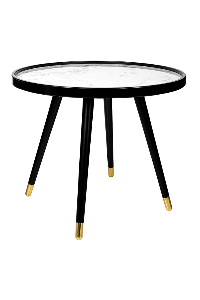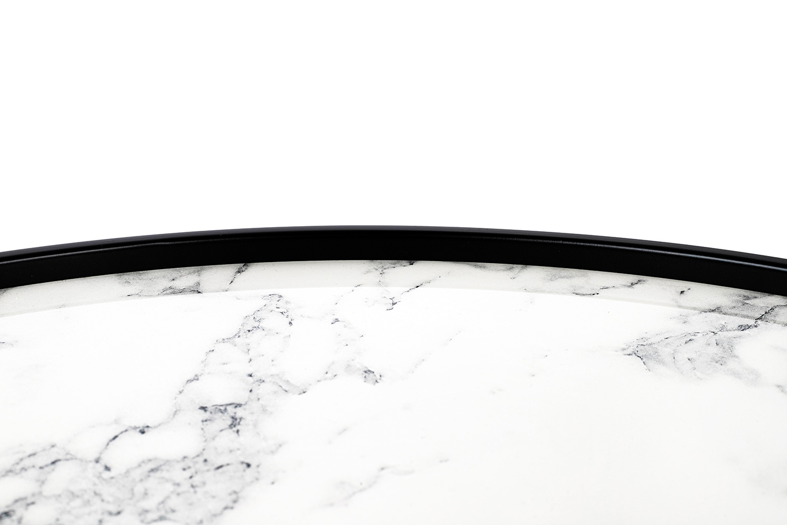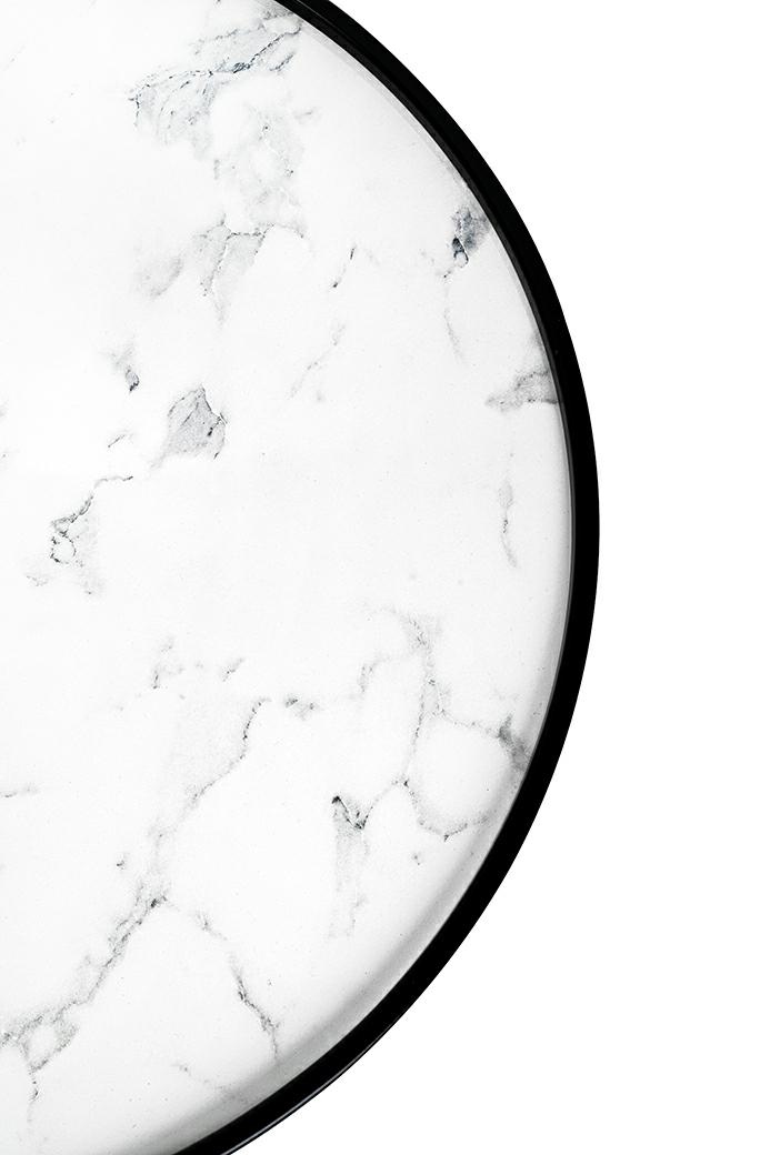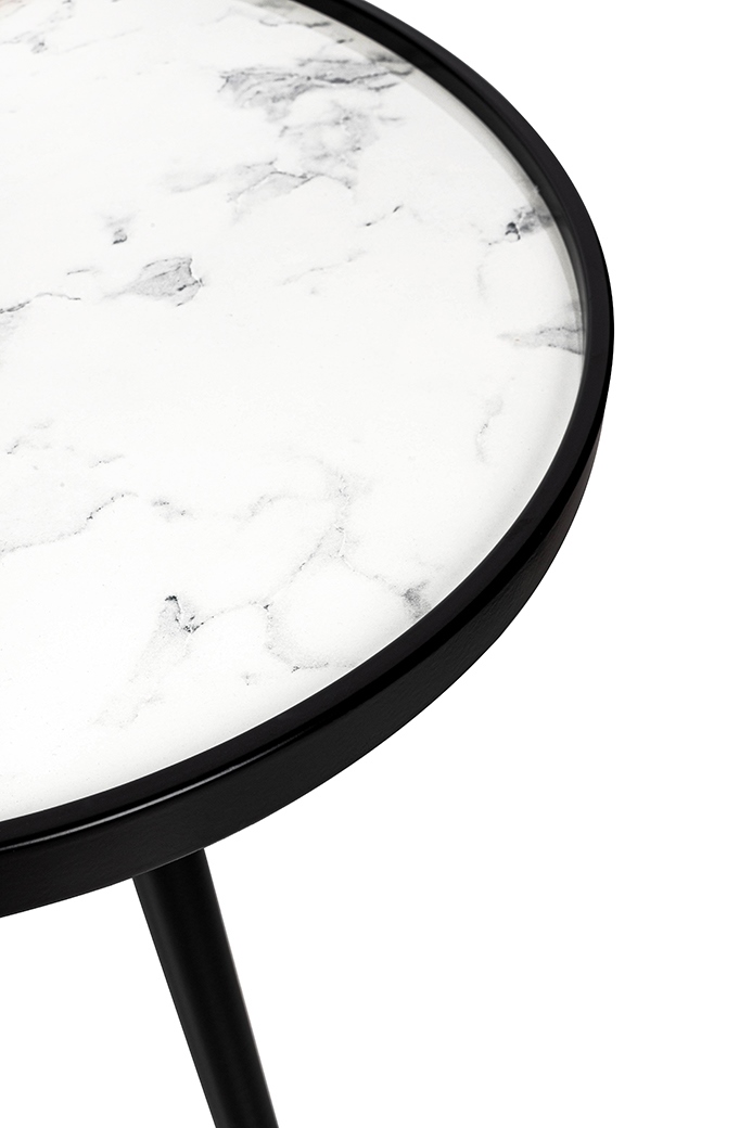 Blat imitujący marmur subtelnie kontrastuje z matowymi, czarnymi nogami i obręczą, tworząc harmonijną, nowoczesną kompozycję.