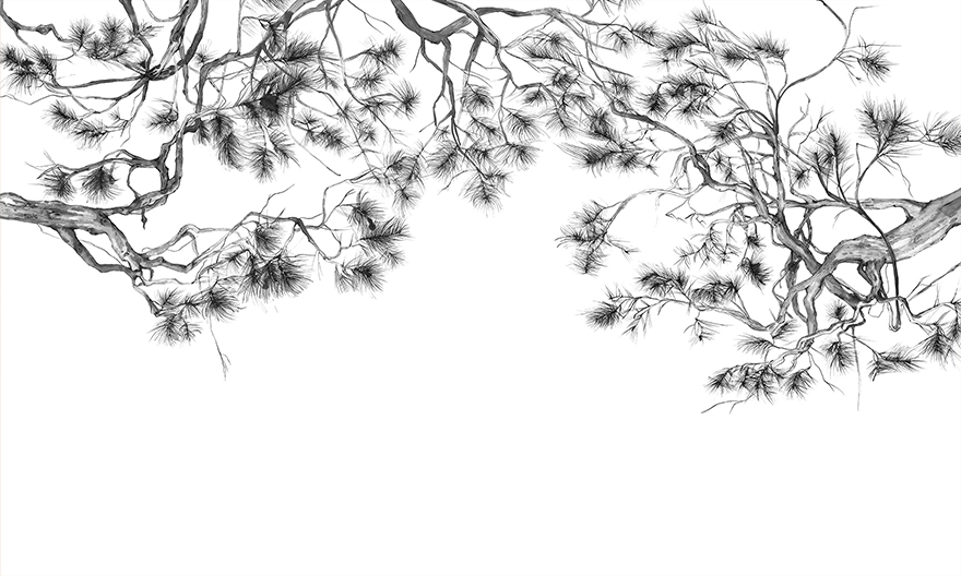 Na grafice widać drobny, linearny rysunek gałązek z liśćmi, prowadzony cienką kreską. Motyw układa się w lekką, rozproszoną siatkę z większą ilością „powietrza” między elementami. Całość jest czarno-biała, z delikatnymi różnicami nasycenia w samym rysunku.