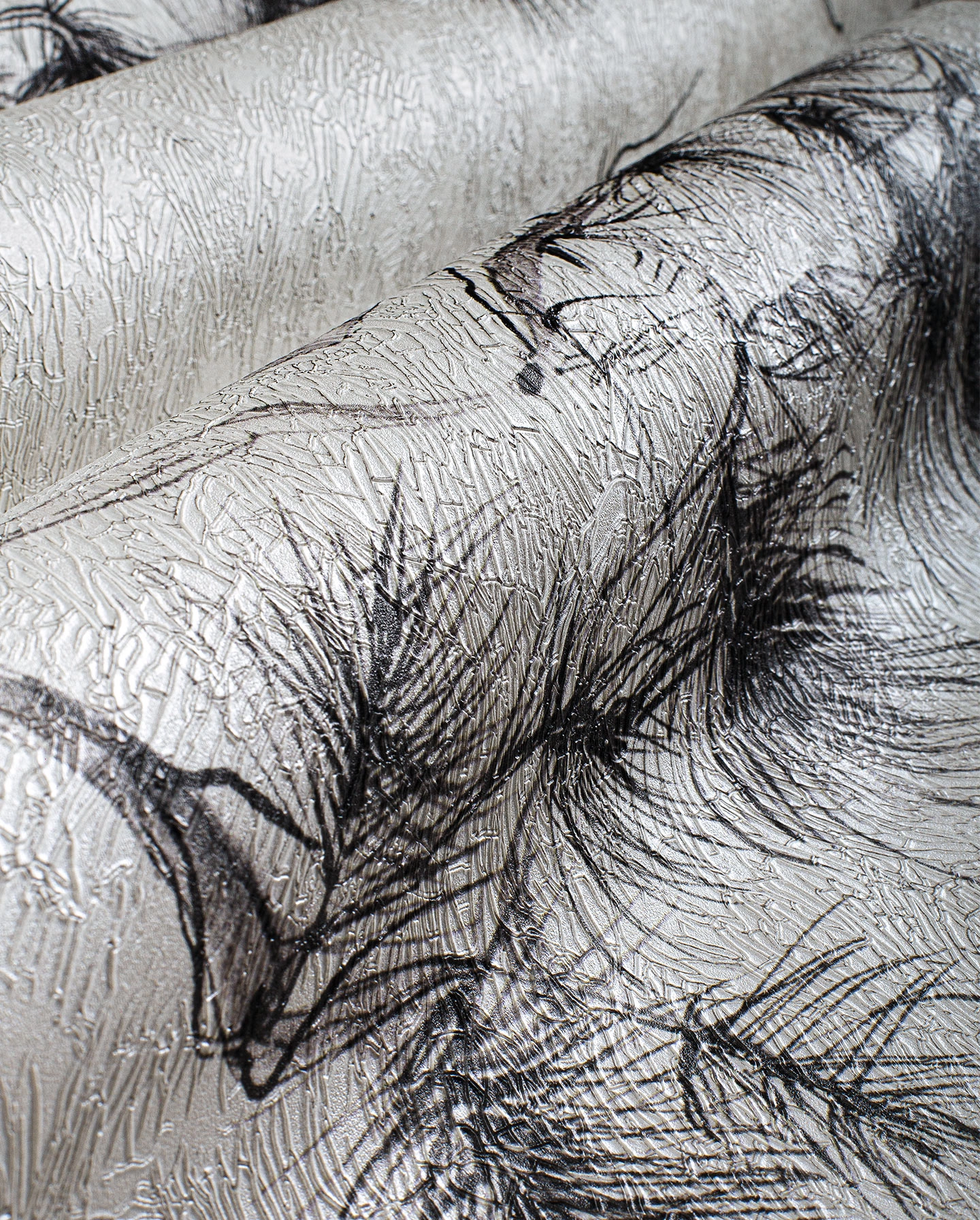 Na grafice widać drobny, linearny rysunek gałązek z liśćmi, prowadzony cienką kreską. Motyw układa się w lekką, rozproszoną siatkę z większą ilością „powietrza” między elementami. Całość jest czarno-biała, z delikatnymi różnicami nasycenia w samym rysunku.
