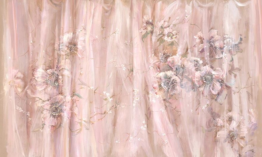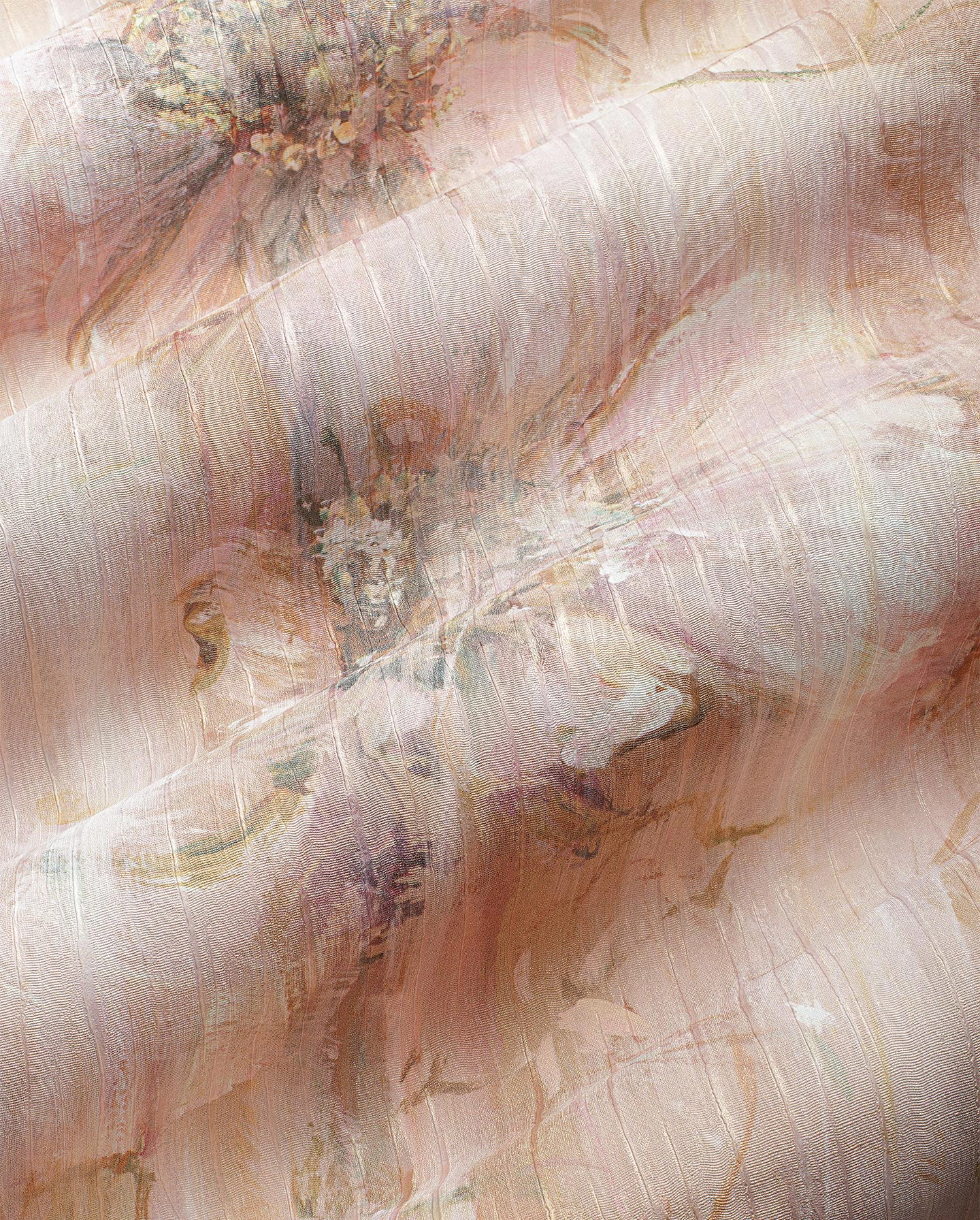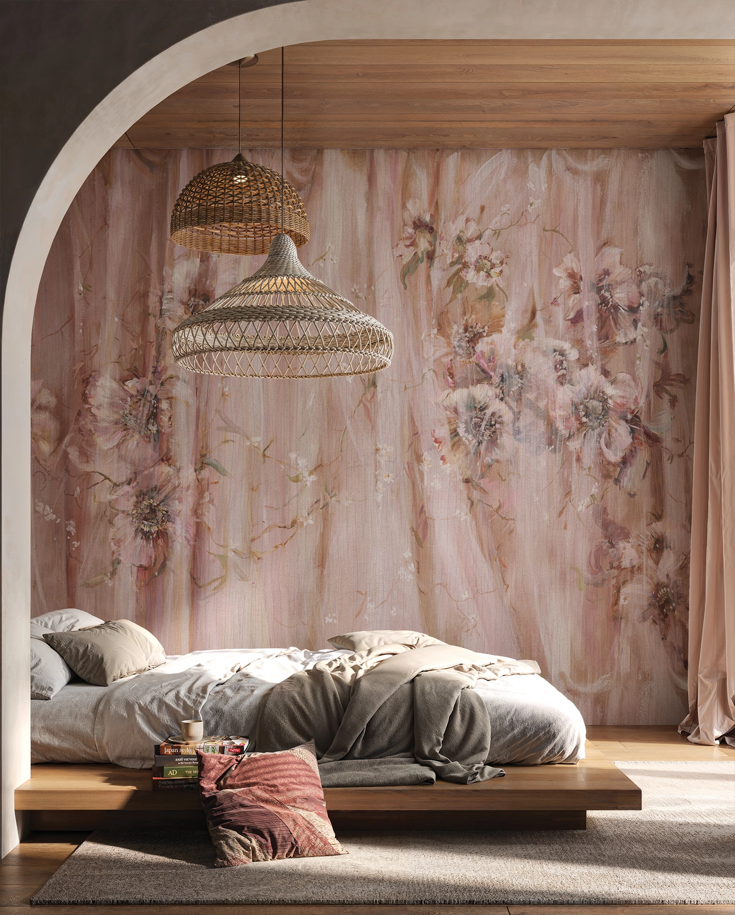 Paleta opiera się na ciepłych beżach, pudrowym różu i przygaszonej szarości, z jasnym, niemal kremowym tłem. Kontrast jest niski, więc motyw nie tworzy twardych podziałów — bardziej porządkuje ścianę pionowym rytmem. W kilku miejscach pojawiają się subtelne jaśniejsze plamy, które nadają wrażenie rozświetlenia.