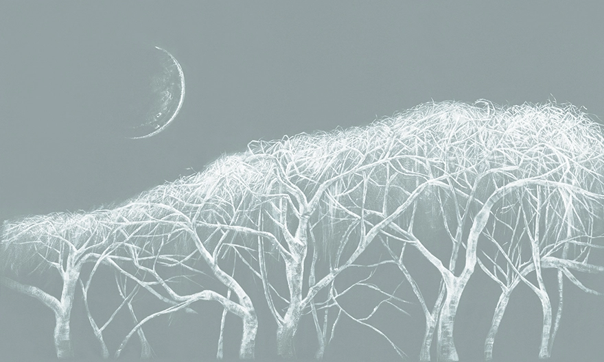 Tło ma chłodny, szaroniebieski ton, bez mocnych plam i kontrastów. Górna część pozostaje prawie pusta, dzięki czemu całość czyta się spokojnie i nie robi ciężkiego wzoru. Przejście między tłem a rysunkiem jest łagodne, z lekkimi rozjaśnieniami w miejscu, gdzie gałęzie są gęstsze.