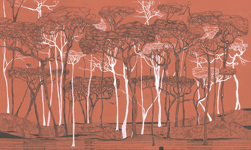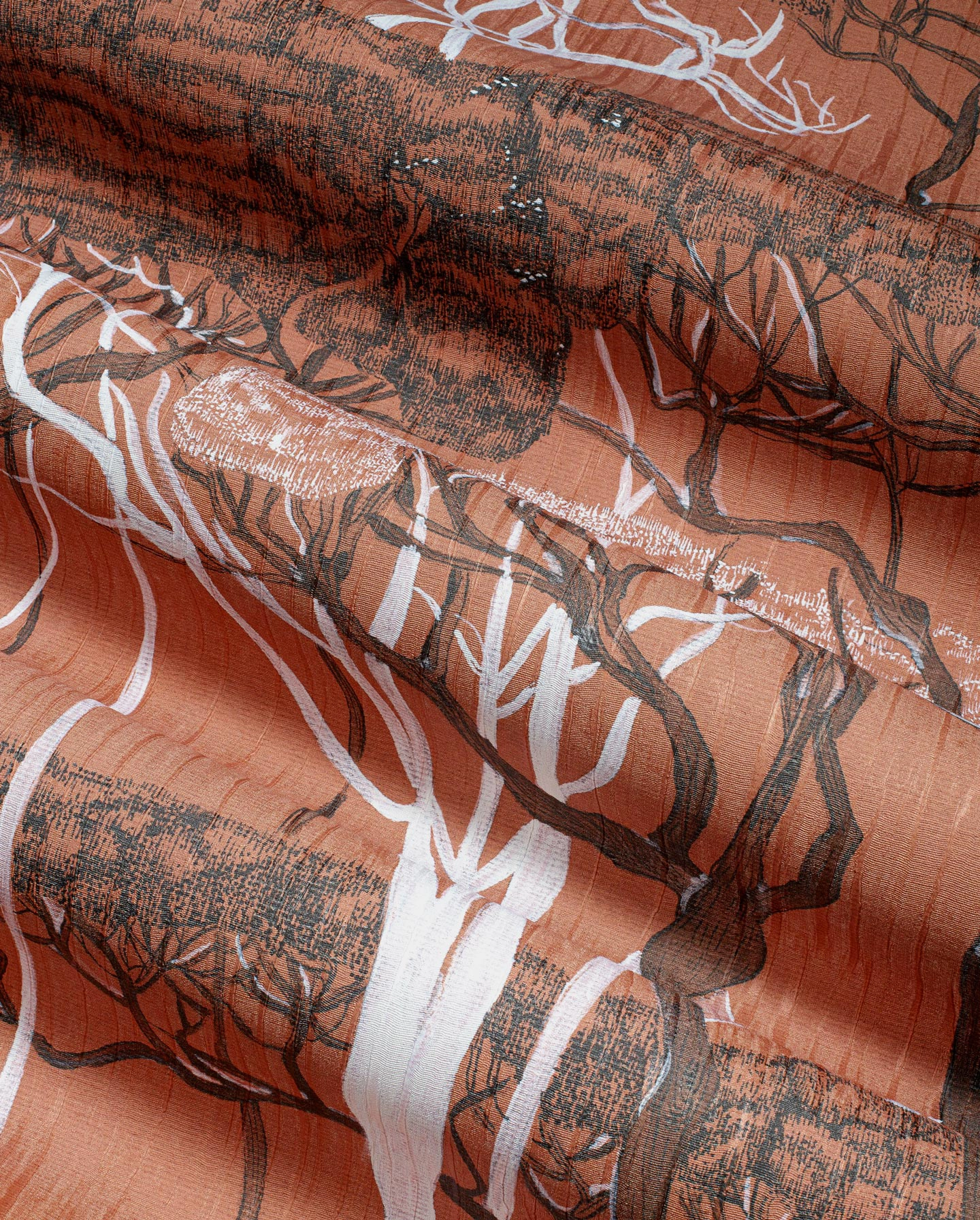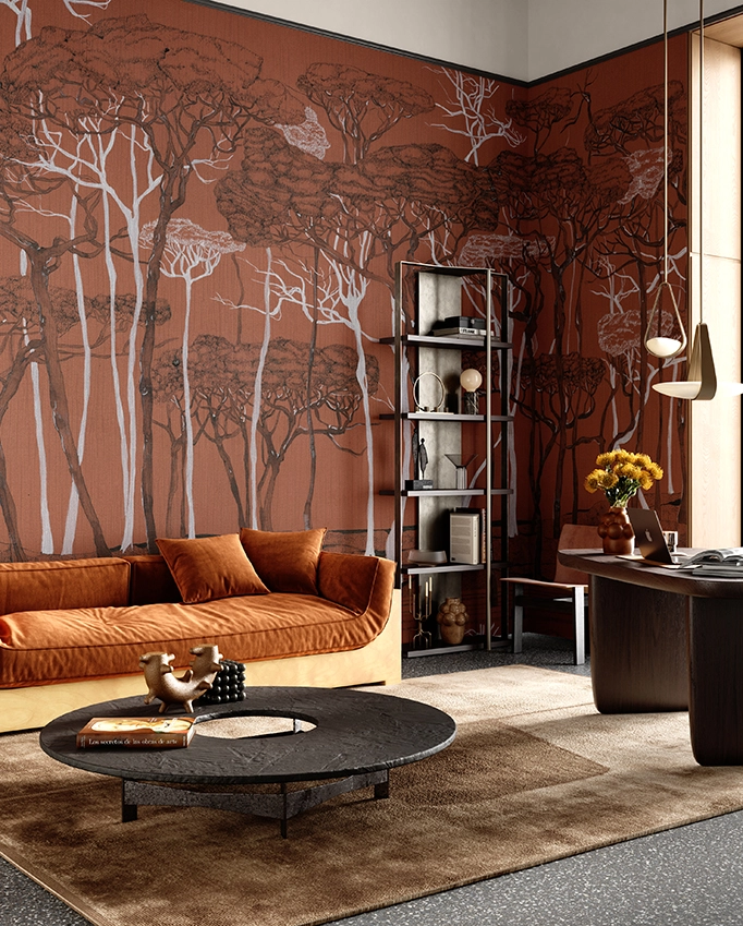 Dominują ciepłe tony: ceglana czerwień, rdzawy brąz i przygaszony pomarańcz, przełamane jasnymi beżami i ciepłą szarością. Kontrast opiera się głównie na różnicy nasycenia między ciemniejszymi smugami a jaśniejszymi prześwitami. Całość ma spójny, ciepły charakter, bez chłodnych akcentów.