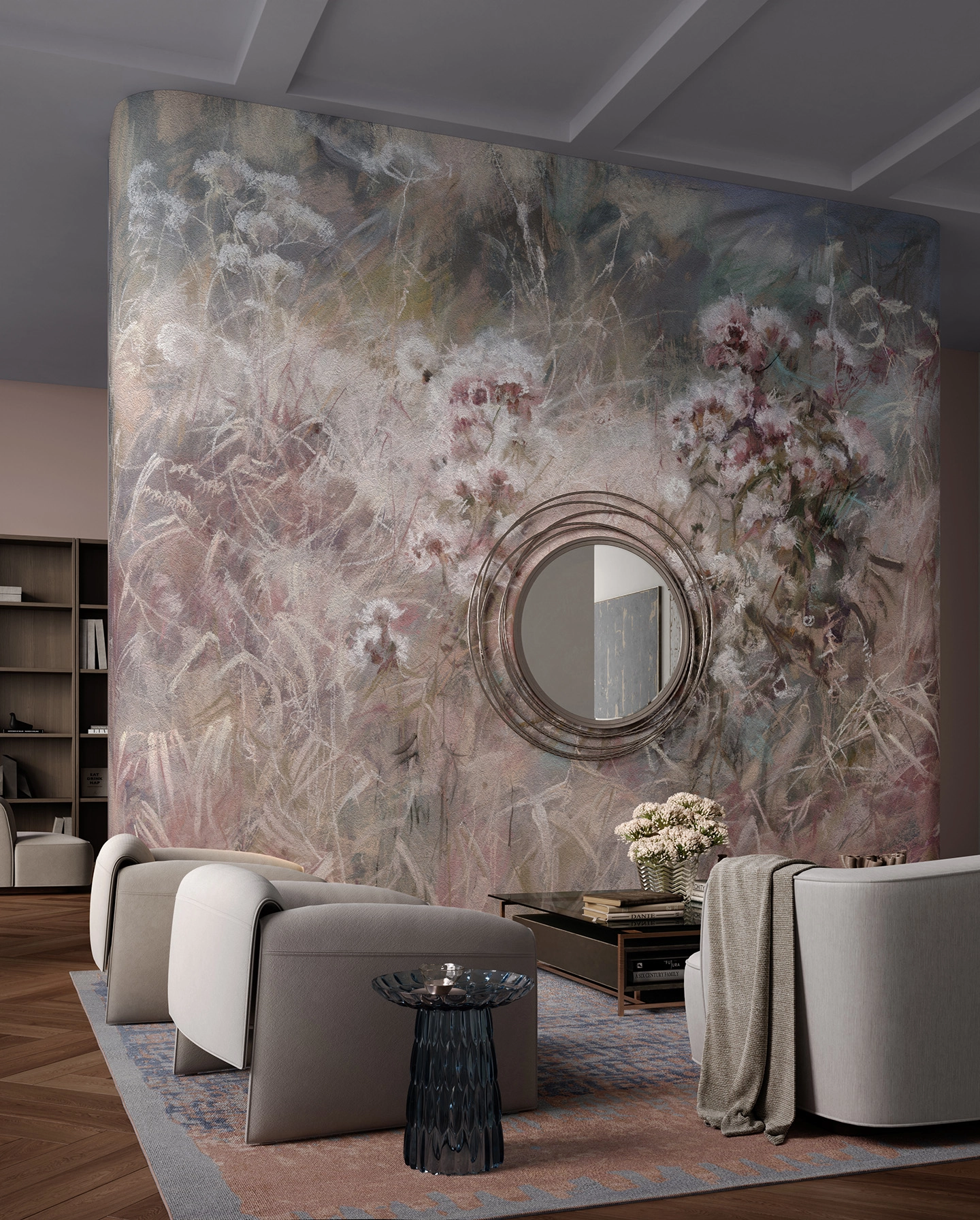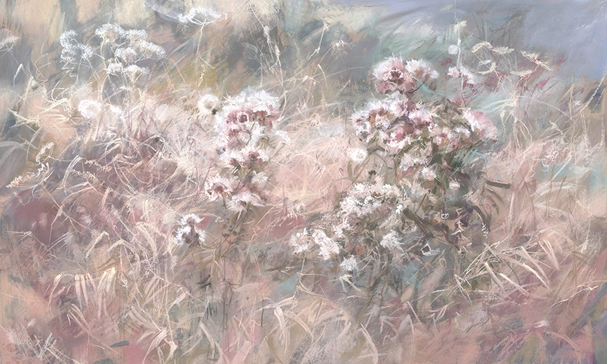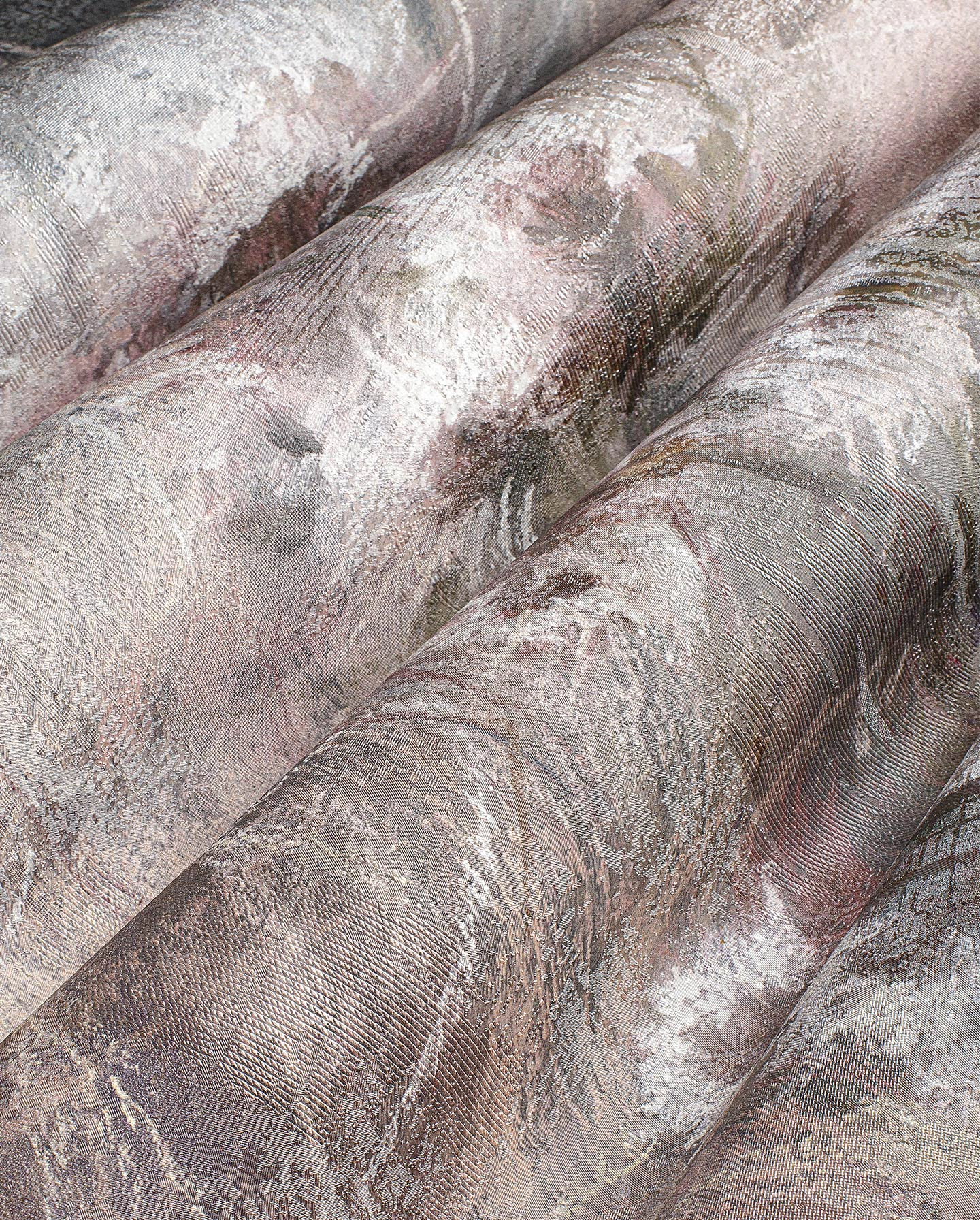 Dominują pudrowe róże, zgaszona czerwień i rdzawy brąz, przełamane szarością i kremowym tłem. Kontrast jest umiarkowany — ciemniejsze plamy są obecne, ale nie tworzą twardych granic. Całość wygląda miękko i warstwowo, z widocznymi przejściami między tonami.