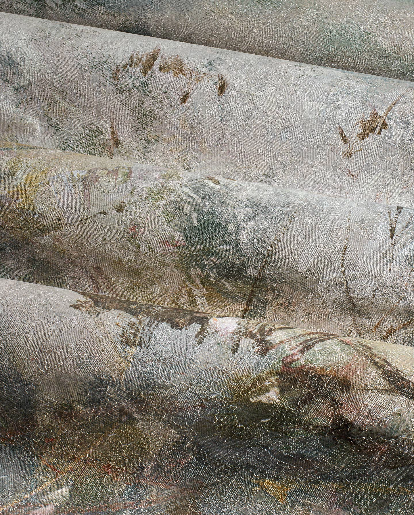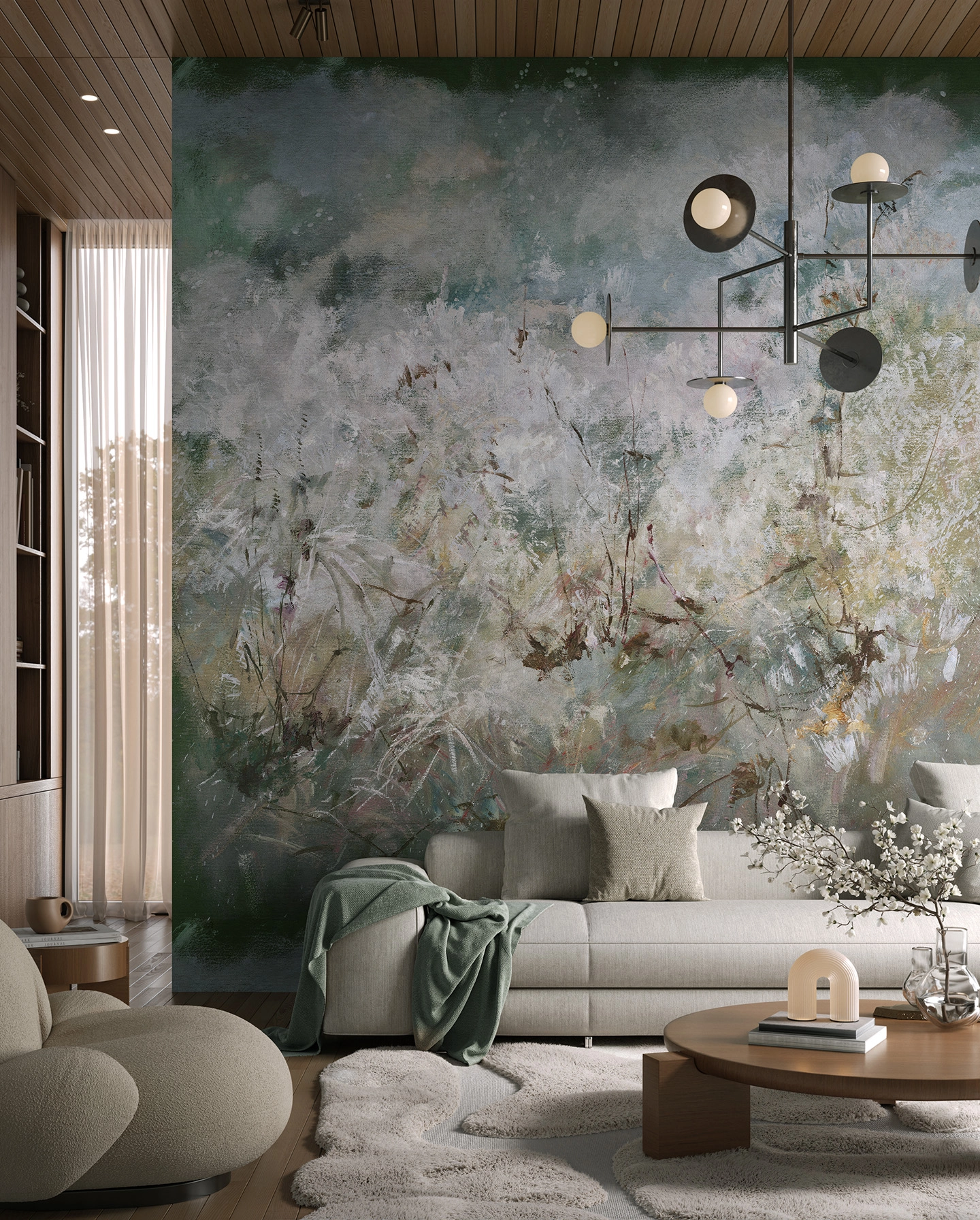 Paleta opiera się na zgaszonych zieleniach, oliwkowych szarościach i ciepłych beżach, z jasnym, mlecznym tłem w górnej części. Najwięcej nasycenia zbiera się w dolnej strefie, gdzie roślinność jest ciemniejsza i bardziej skupiona. Góra pozostaje jaśniejsza i bardziej „pusta”, co daje wrażenie lekkiej mgły.