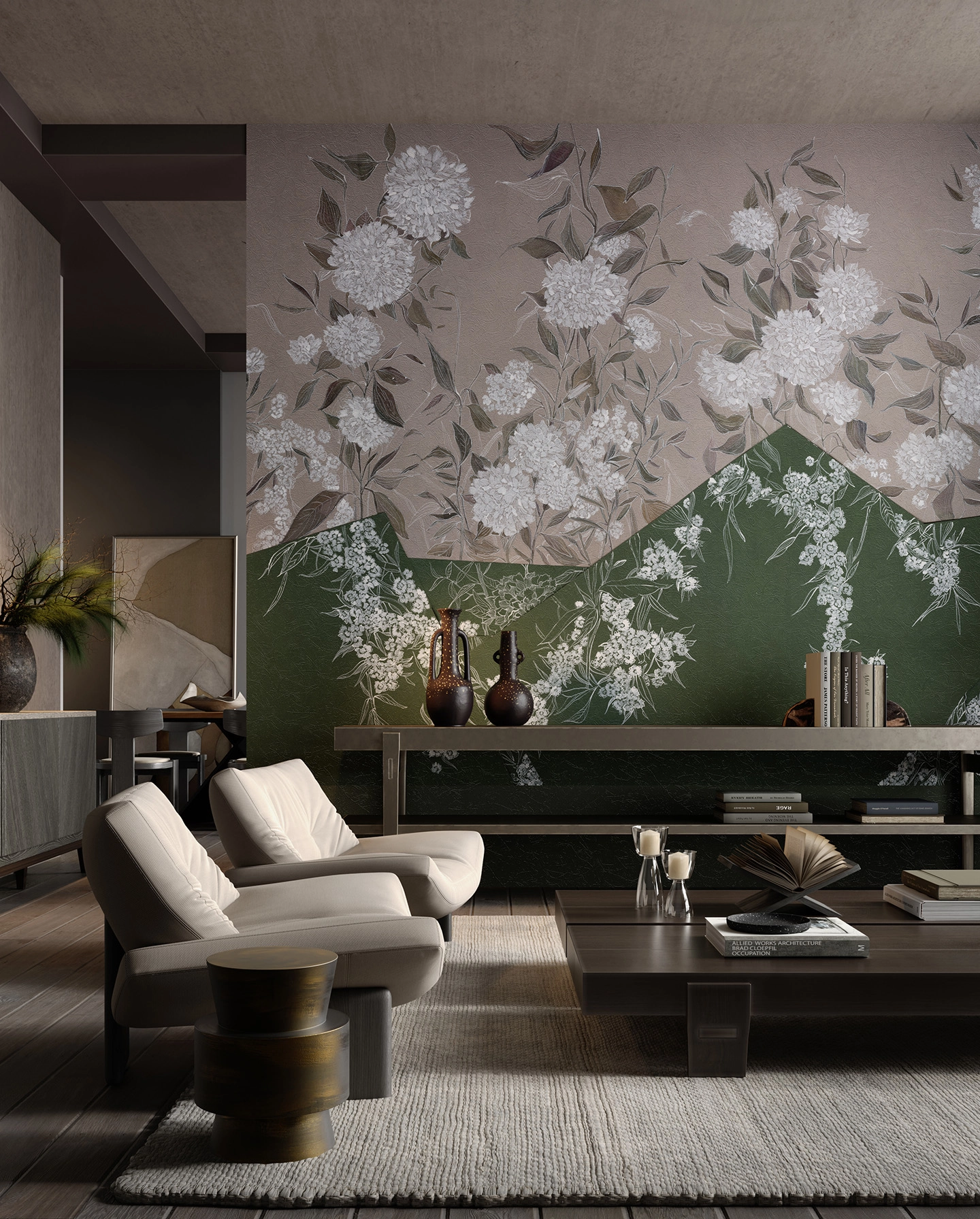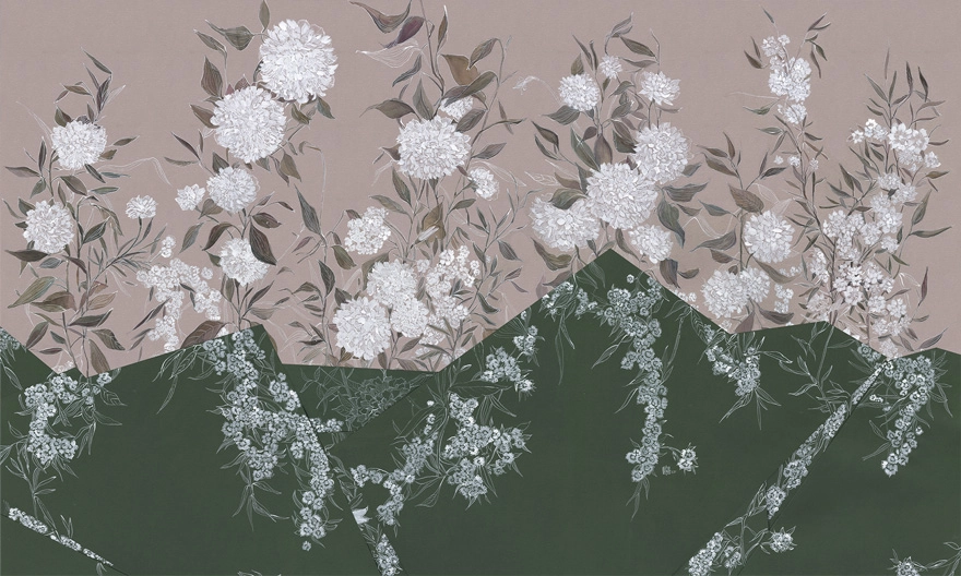 U dołu kadru pojawia się ciemnozielona, zwarta płaszczyzna, która działa jak mocniejsza baza dla jasnych kwiatów. Z tej strefy wychodzą cienkie łodygi i drobne listki w jaśniejszej zieleni, częściowo nachodzące na beżowe tło. Kontrast między jasną górą a ciemnym dołem jest wyraźny, ale sam rysunek pozostaje delikatny.