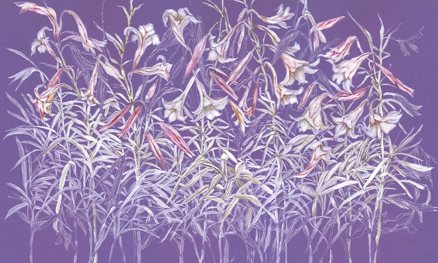 Tło ma jednolity, chłodny odcień fioletu, bez wyraźnych przetarć i plam. Jasny rysunek roślin mocno odcina się od tła, ale dzięki cienkiej kresce nie robi ciężkiej kompozycji. Kontrast opiera się na prostej relacji jasne–ciemne, bez dodatkowych kolorów.