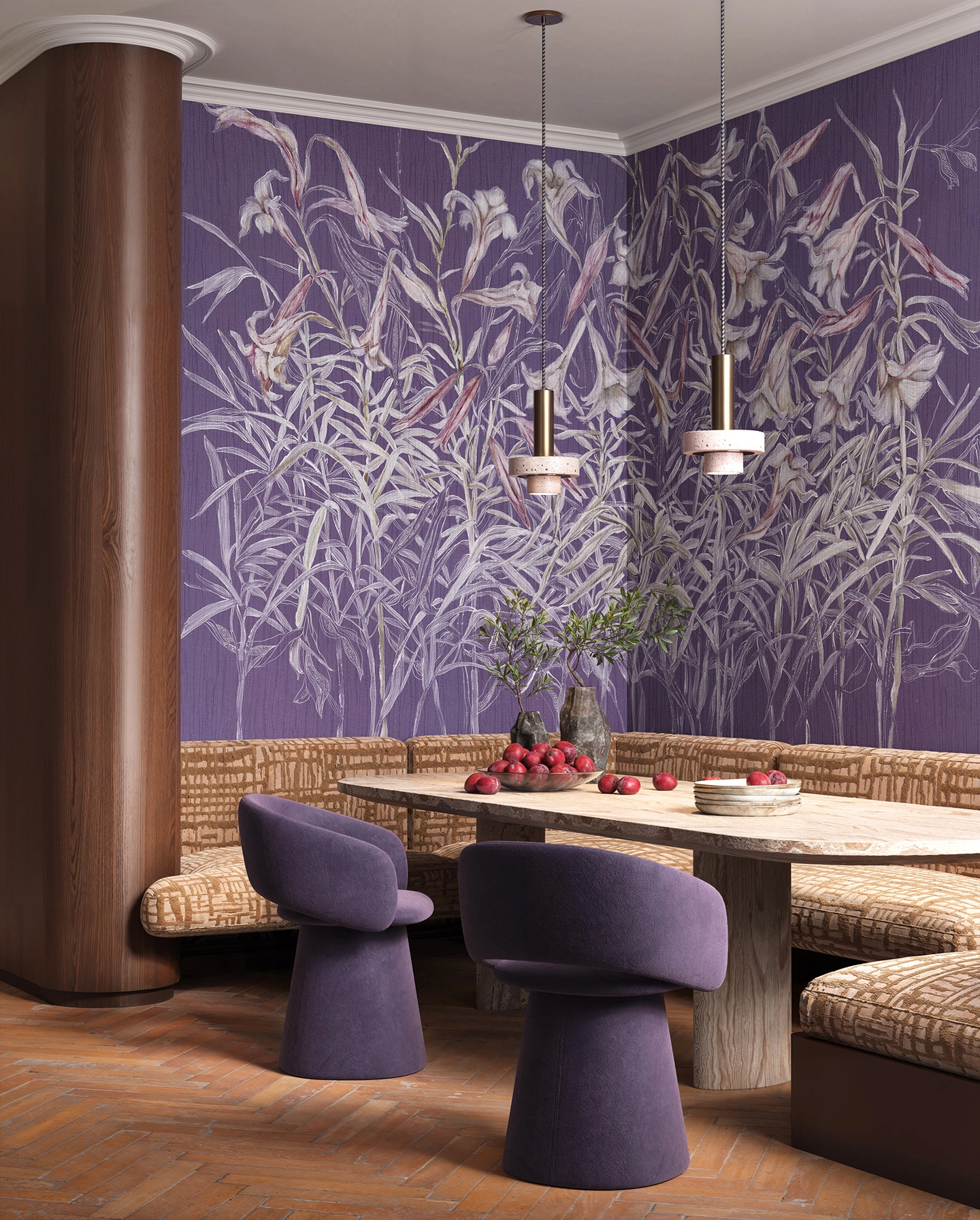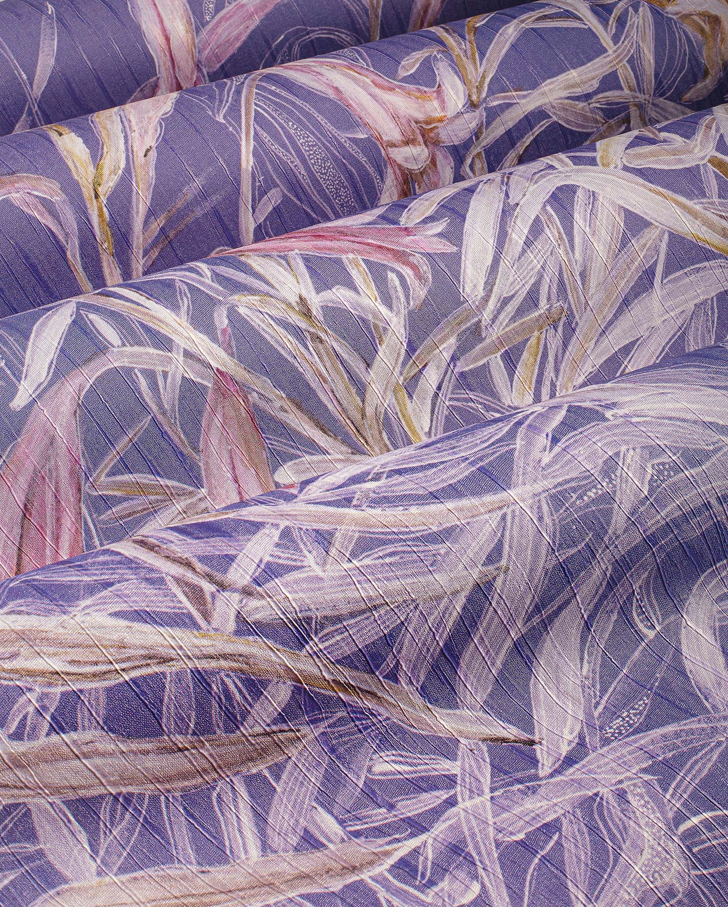Próbka pozwala sprawdzić, jak nasycony jest fiolet w Twoim świetle oraz czy drobny rysunek pozostaje czytelny z kilku metrów. W zależności od podłoża inaczej może być widoczne tło i delikatne różnice w jasności rysunku. Jeśli zależy Ci na fragmencie z bardziej zagęszczonym pasem roślin albo z większą ilością pustego tła, warto zamówić próbkę z wybranego kadru.