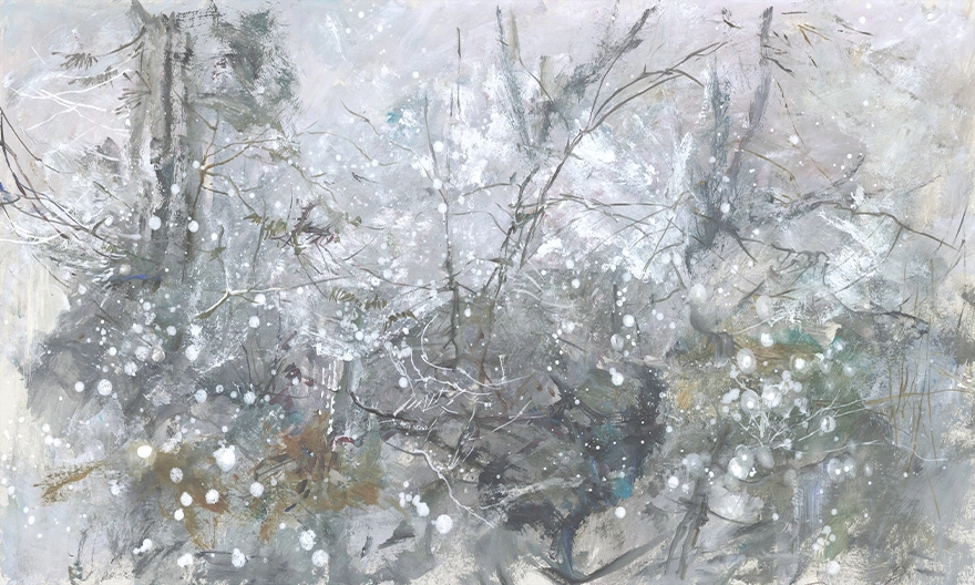 Na grafice widać cienkie pnie i rozgałęzione konary zaznaczone jasnoszarą kreską, miejscami zagęszczoną w plamy. Linie krzyżują się i nachodzą na siebie, tworząc wrażenie gęstego zarośla. Detal jest szkicowy, bez mocno wyrysowanych konturów. Widoczny motyw zimy.