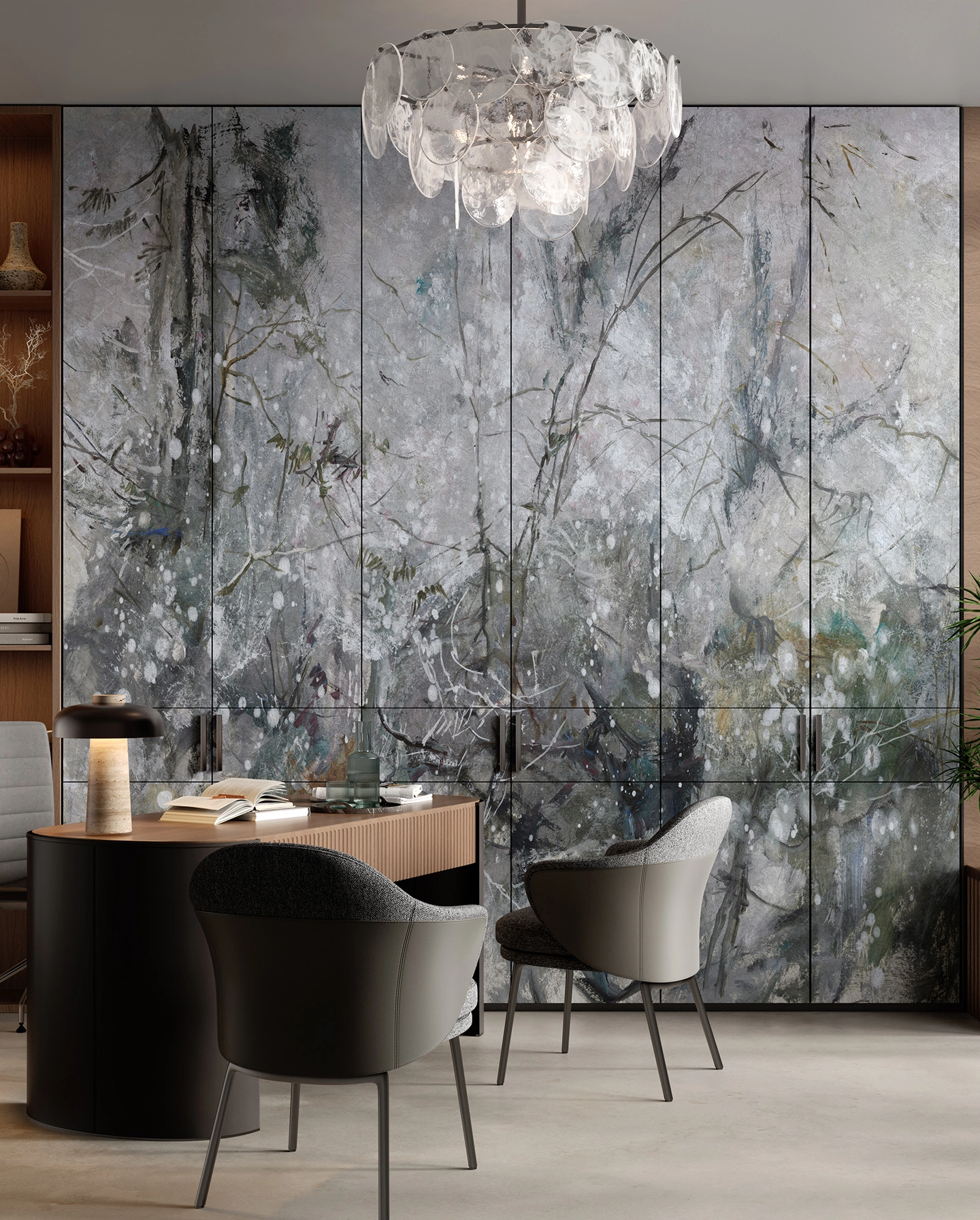 Próbka pomaga ocenić, jak czytelne są cienkie gałęzie w Twoim świetle i czy chłodna szarość nie zlewa się z tłem z większej odległości. W zależności od podłoża inaczej może być widoczna „mgła” tła oraz różnice między jasną kreską a ciemniejszymi akcentami. Jeśli zależy Ci na fragmencie z bardziej zwartym układem gałęzi albo z większą ilością jasnych prześwitów, warto zamówić próbkę z wybranego kadru.
