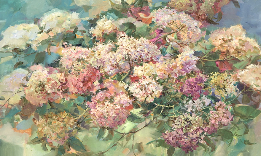 Paleta opiera się na odcieniach różu, łososia i koralu, przełamanych beżem i kremowymi rozjaśnieniami na płatkach. Zieleń jest stonowana i działa jak tło, nie wybija się na pierwszy plan. Kontrast jest umiarkowany, a granice barw są miękkie, jak w malarskim rozprowadzeniu farby.