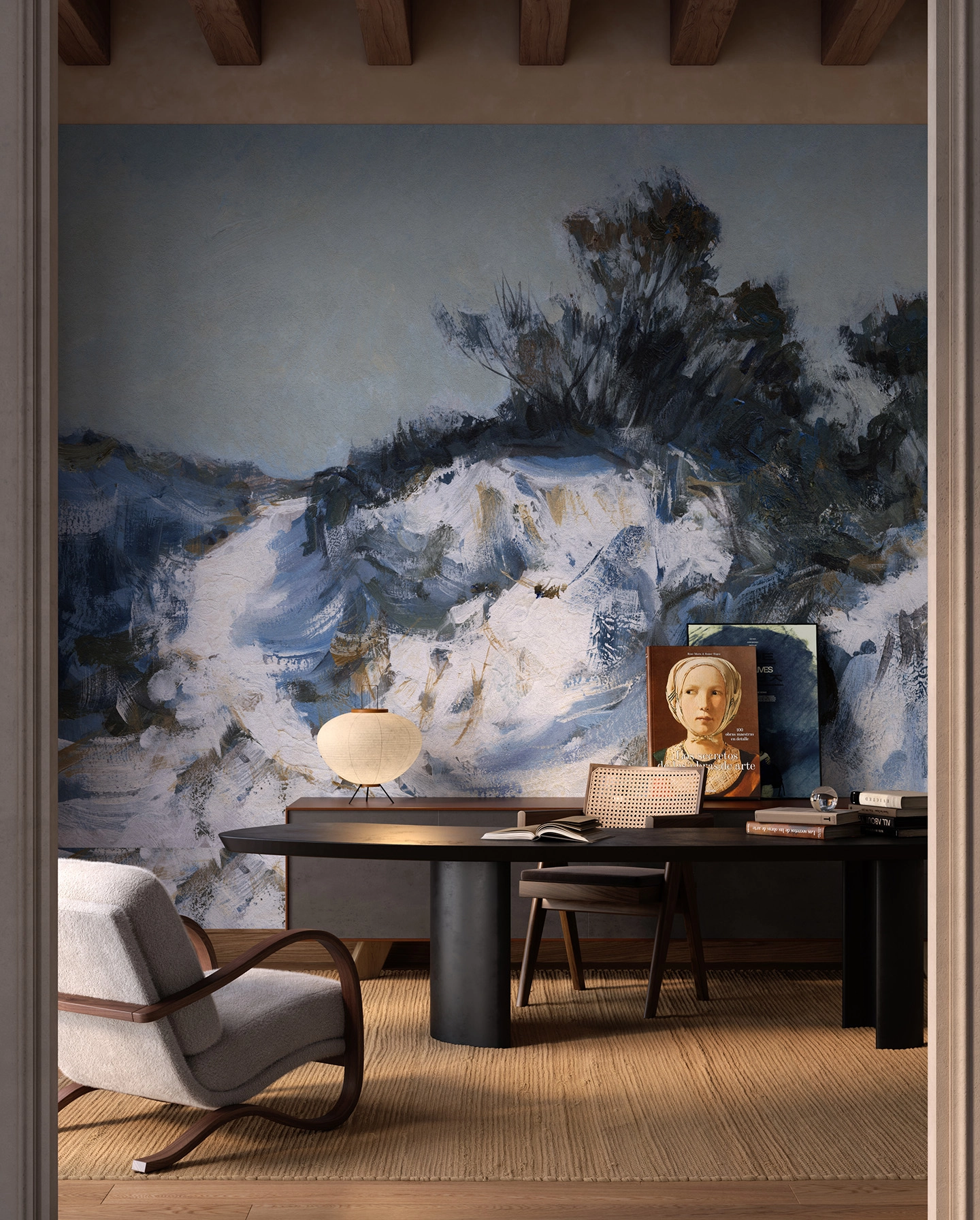Dominują chłodne błękity, stalowe szarości i biel, z niewielką ilością cieplejszych tonów. Tło jest jasne i czyste, co podbija kontrast i sprawia, że ciemniejsze fale są bardziej wyraziste. Kompozycja wygląda jak warstwowy, malarski gest, bez drobnego detalu.
