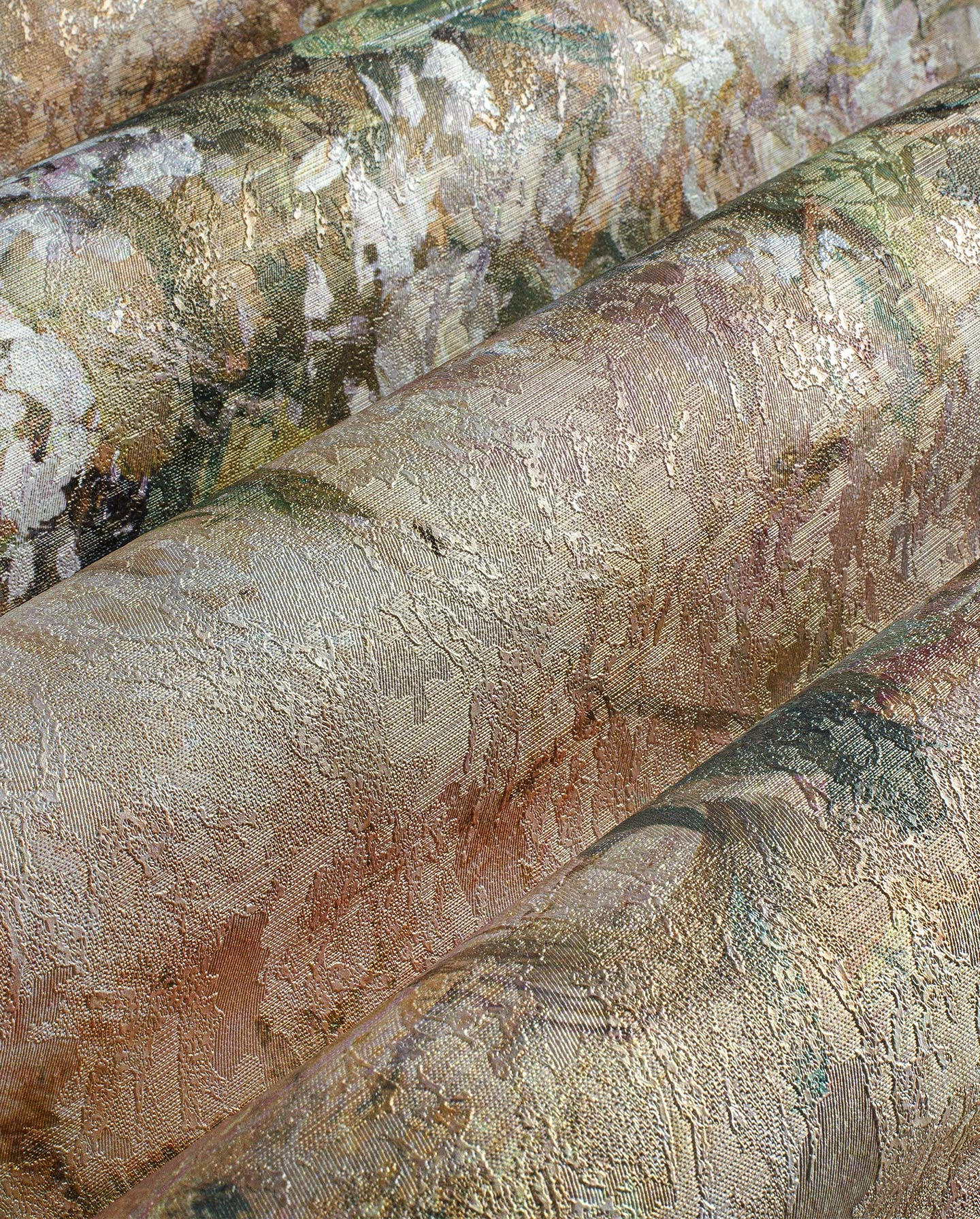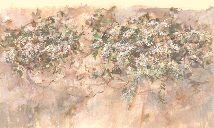 Tło ma ciepły odcień beżu z brzoskwiniowym tonem, miejscami z rozmytymi plamami i przetarciami. Kontrast między liśćmi a tłem jest niski, dzięki czemu całość wygląda spokojnie i jednolicie. Kolor nie układa się w wyraźne pasy — raczej w delikatną „mgłę” na całej powierzchni.