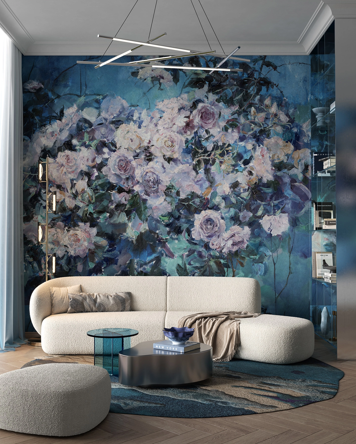 Próbka pozwala ocenić, jak czerń tła prezentuje się w konkretnym oświetleniu oraz czy jasne kwiaty pozostają czytelne i lekkie przy oglądaniu z większej odległości. Różne podłoża mogą wpływać na sposób odbijania światła przez ciemne partie oraz na widoczność delikatnych cieni w strukturze kwiatów. Jeśli istotny jest kadr z gęstszą kompozycją lub większym udziałem ciemnego tła, warto zamówić próbkę obejmującą wybrany fragment wzoru.
