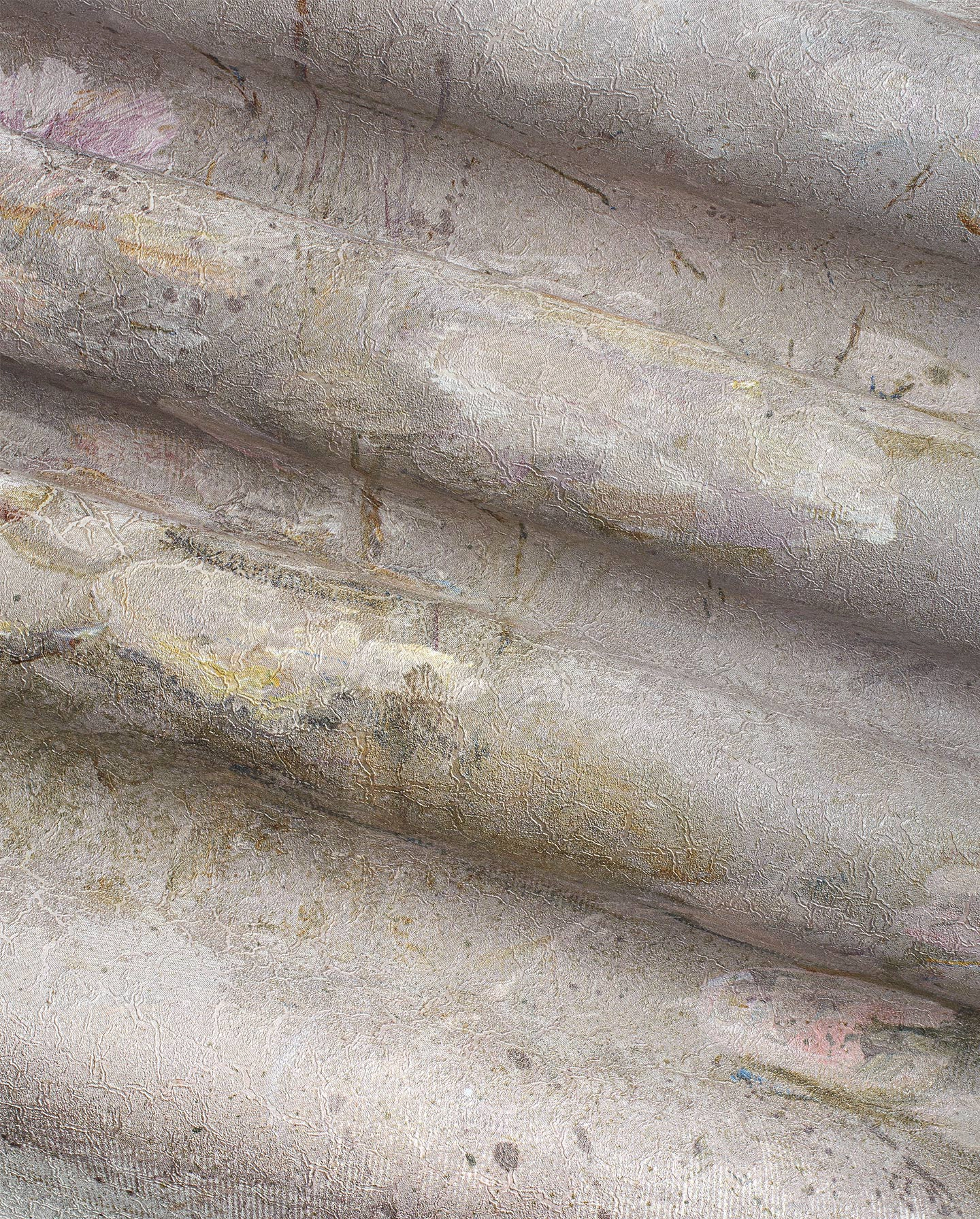 Kolorystyka opiera się na chłodnych szarościach z lekko niebieskawym tonem w górnej strefie oraz na beżach i taupe w partiach środkowych. W dolnym pasie pojawiają się ciemniejsze, przydymione brązy i szarości, które tworzą bardziej kontrastową, „ziarnistą” strukturę. Kolory nie mają ostrych granic — przechodzą w siebie płynnie, z miejscowymi rozjaśnieniami.
