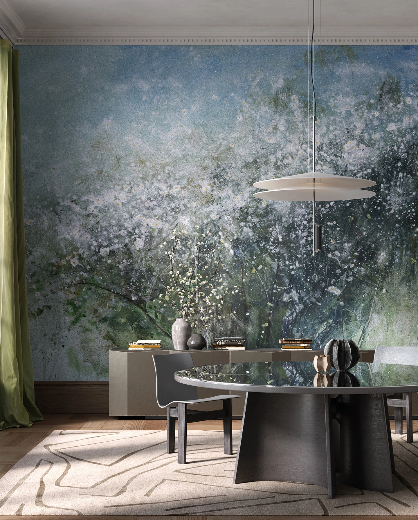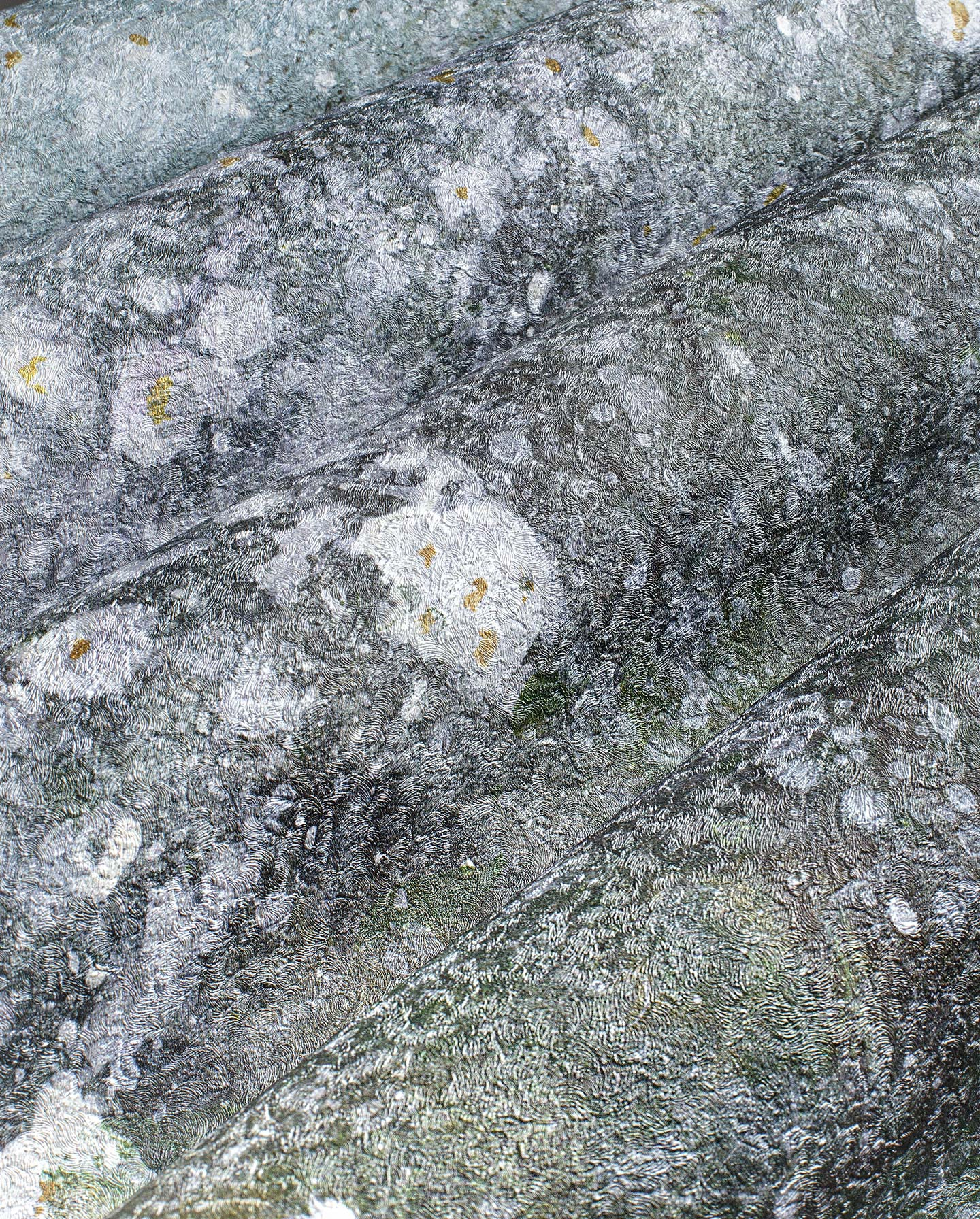 Kolorystyka opiera się na chłodnych błękitach i szarościach, z domieszką przygaszonej zieleni i granatu w gęstszych partiach. Najciemniejsze miejsce wpada w grafit i bardzo ciemny niebiesko-zielony, a wokół niego widać jaśniejsze, mleczne przejścia do niemal białych fragmentów tła. Kontrast jest wyraźniejszy w centrum skupiska, natomiast na obrzeżach wzór „rozpuszcza się” w tle i traci ostrość.