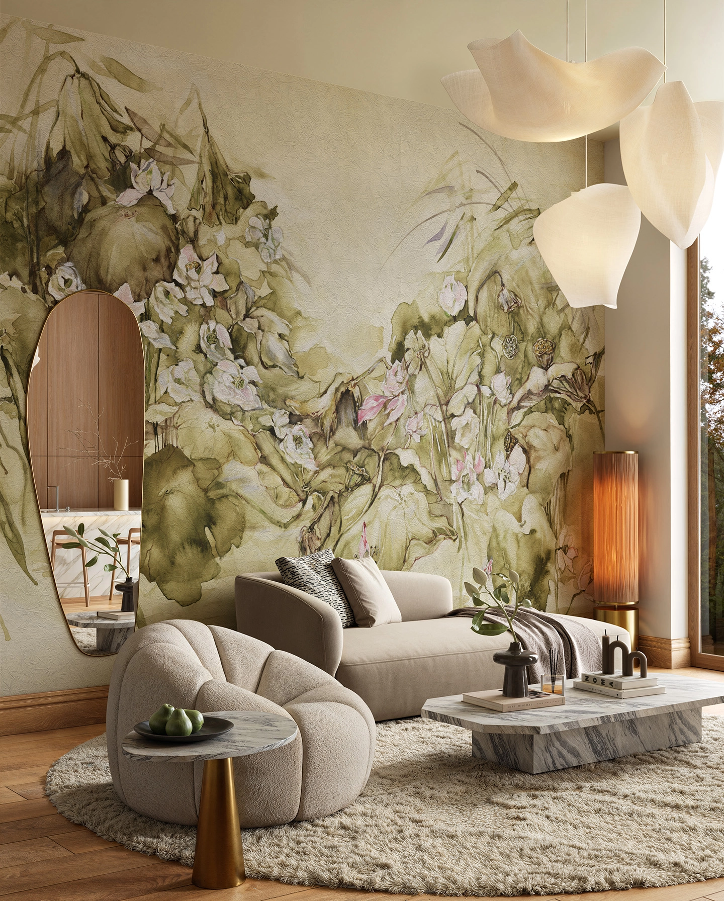 Kolorystyka opiera się na jasnych beżach i złamanej bieli, z przygaszonymi zieleniami w rysunku roślinnym. Pojawiają się też tony oliwkowe i khaki, a w tle miejscami widać lekko szarawy, przydymiony cień, który podbija głębię plam. Kontrast pozostaje spokojny — zieleń jest stonowana i nie odcina się ostro od jasnej bazy.