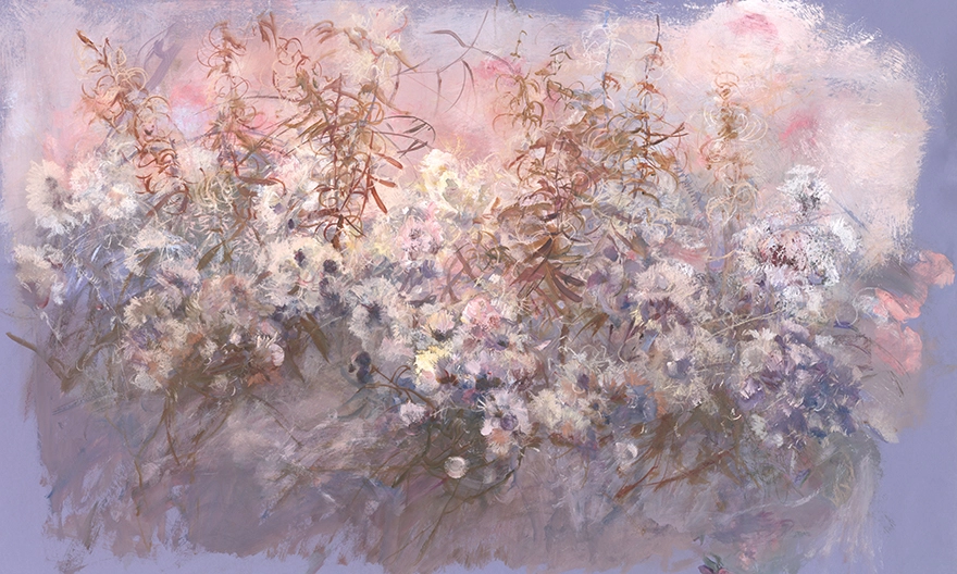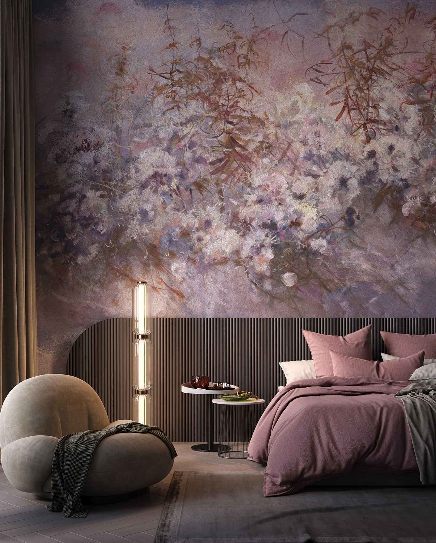 Tło jest jasne, w tonach złamanej bieli z domieszką beżu i chłodnej szarości. Kwiaty przechodzą przez pudrowy róż, lila i przygaszony fiolet, z miejscami cieplejszymi plamami brzoskwini i beżu; najciemniejsze akcenty pojawiają się w gałązkach (brąz, grafit).