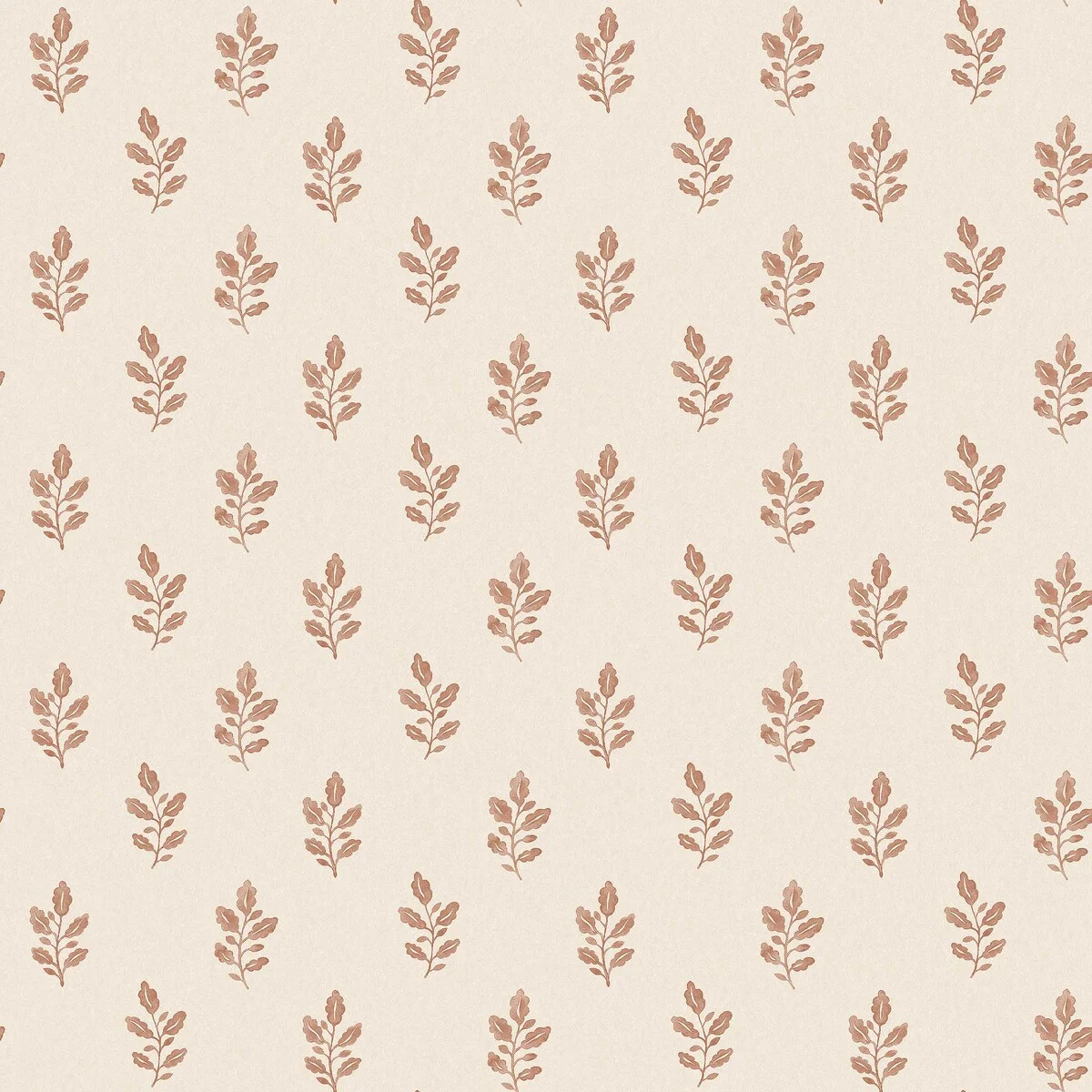 Tapeta ścienna z drobnym wzorem przedstawiającym liście dębu rozmieszczone w regularnym układzie. Motyw inspirowany naturą utrzymany jest w kremowej kolorystyce z czerwonymi i bursztynowymi elementami, dzięki czemu ściana zyskuje ciepły, dekoracyjny charakter.