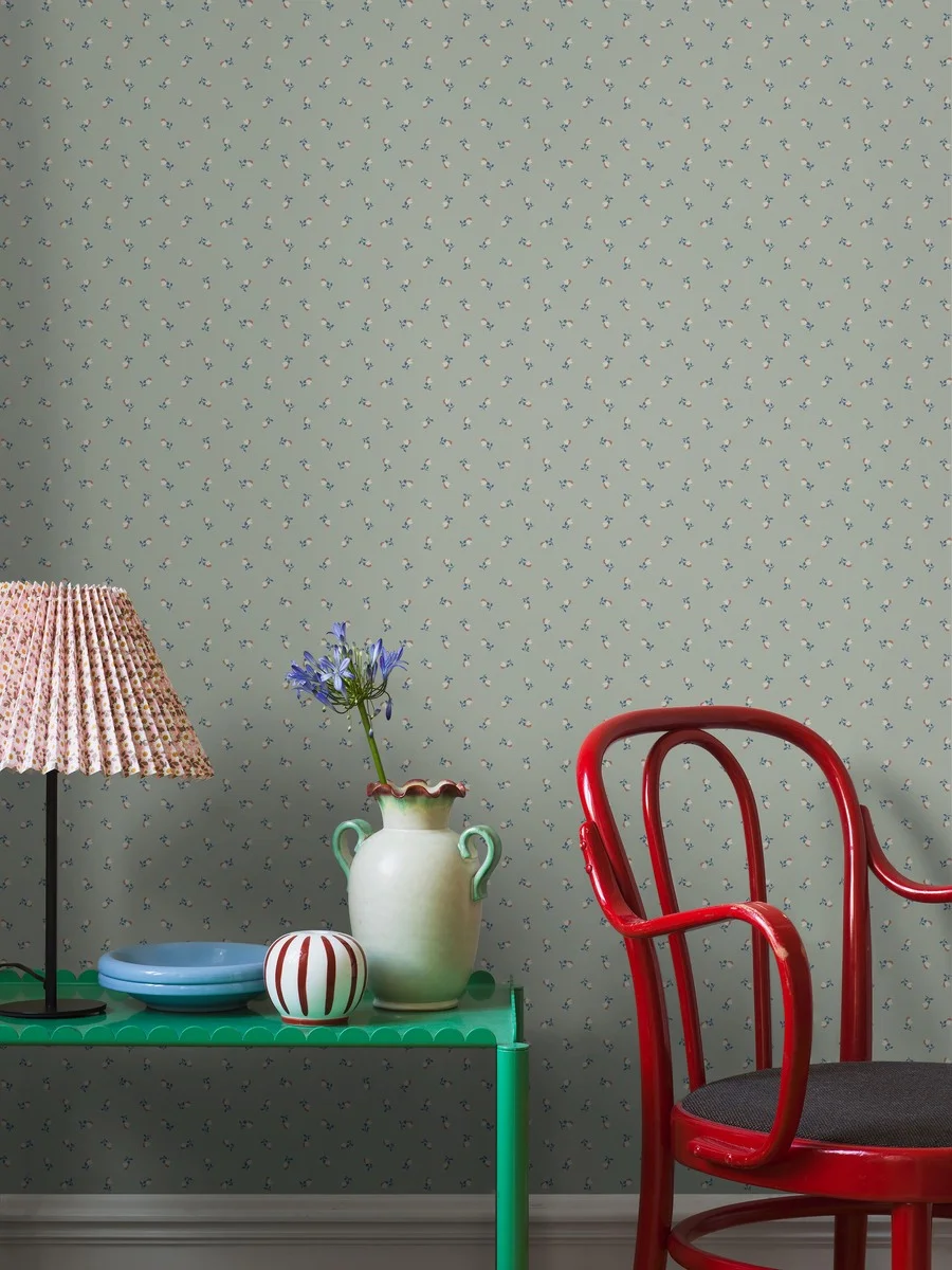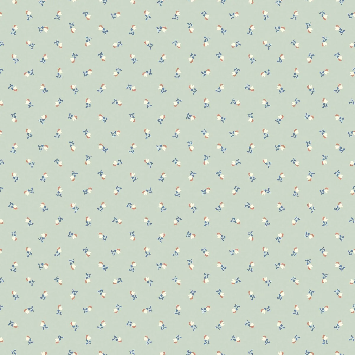 Tapeta ścienna z drobnym wzorem przedstawiającym delikatne gałązki i liście ułożone w regularnym układzie. Motyw utrzymany jest w zielonej kolorystyce, dzięki czemu ściana zyskuje naturalny i spokojny charakter.