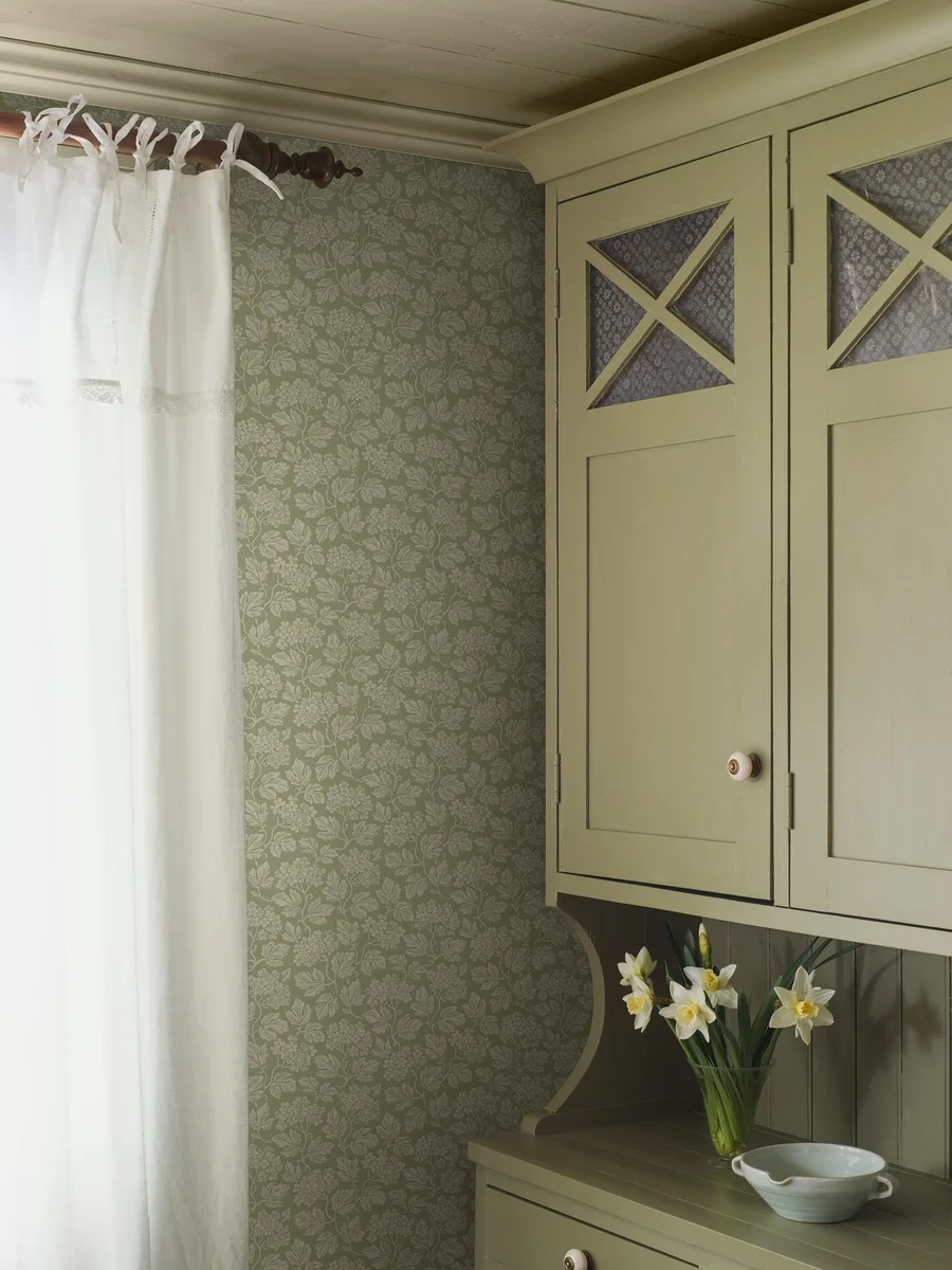 Model Hagtorn 8083 z kolekcji Anno II to niewielki, regularny motyw roślinny osadzony na zielonym tle. Wzór jest równomiernie rozmieszczony i zachowuje rytmiczny układ, dzięki czemu ściana zyskuje dekoracyjny efekt bez nadmiernego przytłoczenia. Zieleń nadaje wnętrzu naturalny, spokojny charakter.