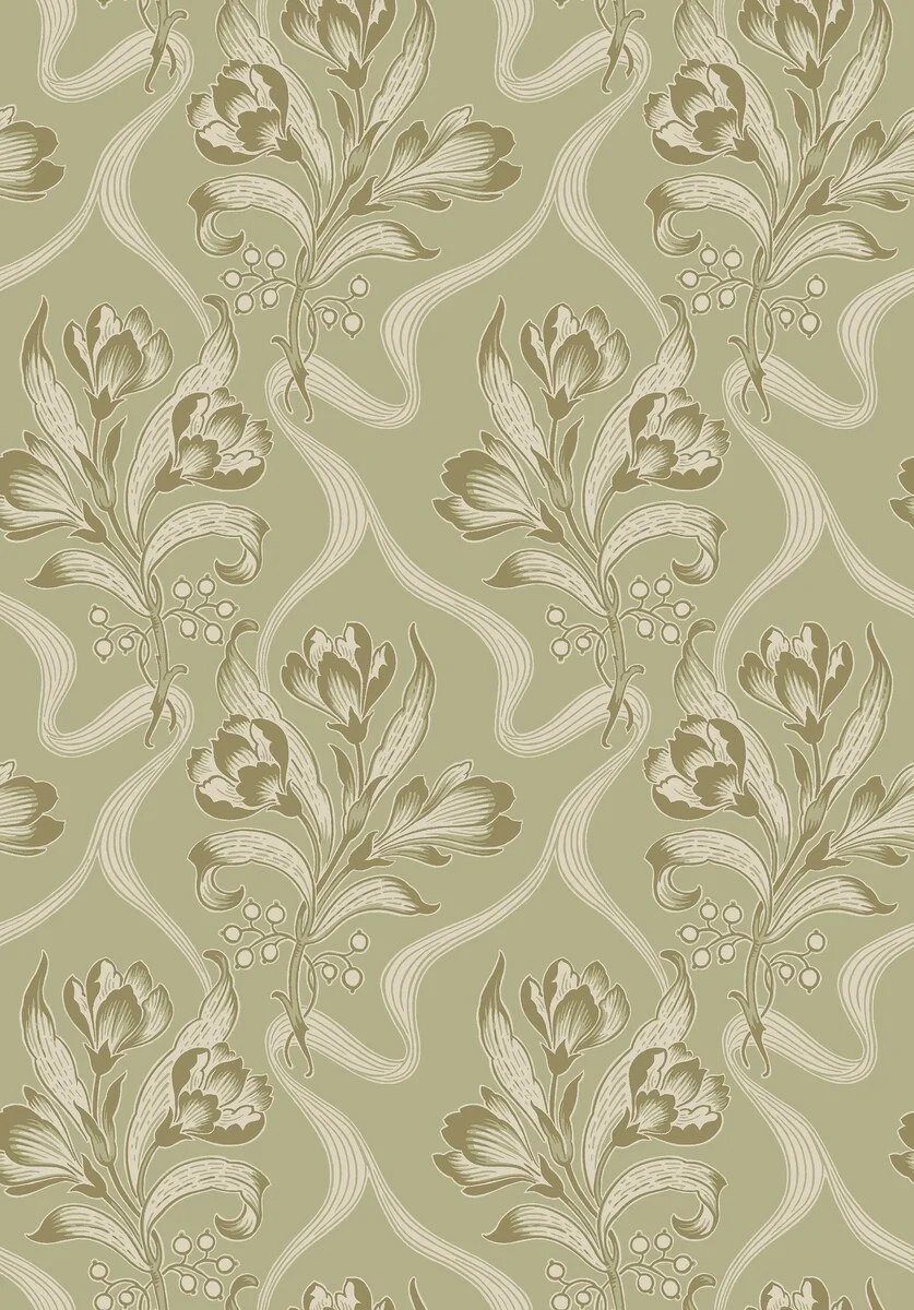 Tapeta zielona Boråstapeter Jugendbukett 8071 z dużym bukietowym wzorem w stylu secesyjnym