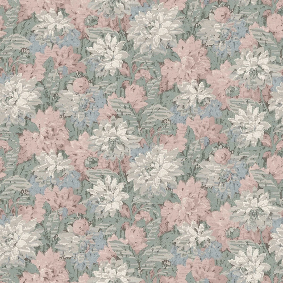Tapeta Delilah 8171 marki Boråstapeter pochodzi z kolekcji Charm. Wzór bazuje na archiwalnym projekcie z początku XX wieku i przedstawia duże kwiaty dalii tworzące gęsty ornament w stylu tapiserii.