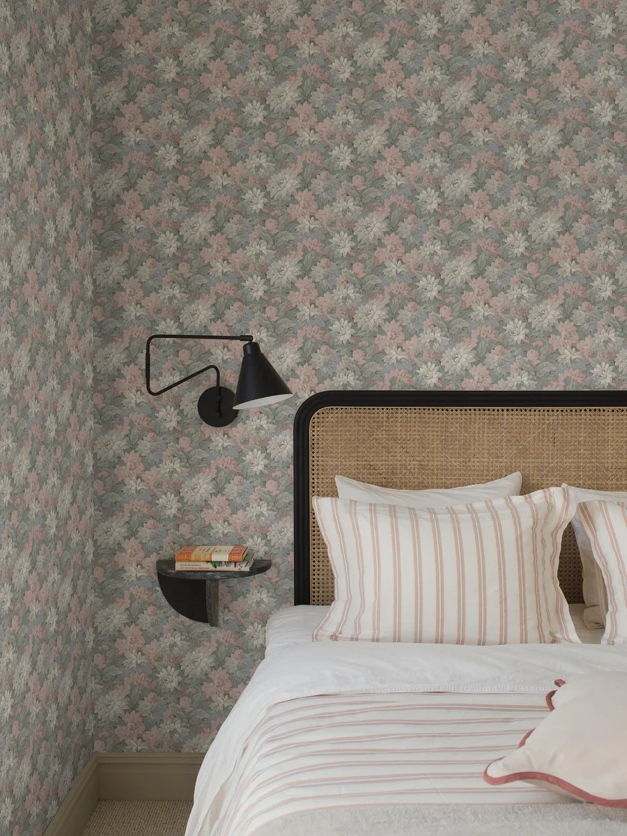 Motyw składa się z wielu nachodzących na siebie kwiatów i liści, dzięki czemu wzór ma wyraźną strukturę i głębię. W tej wersji kolorystycznej zastosowano jasne pastelowe barwy, które nadają wnętrzu lekkości i naturalnego charakteru.
