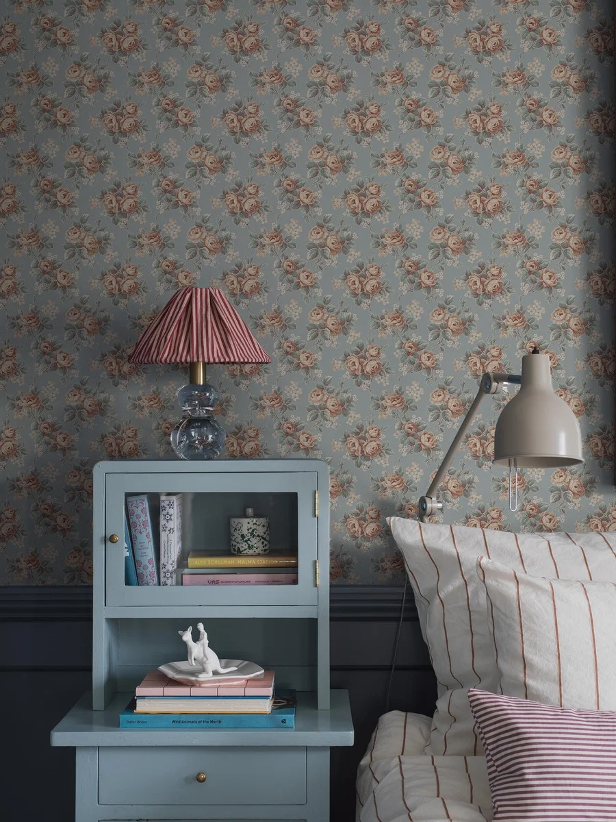Wzór dobrze sprawdza się w salonie, sypialni oraz w jadalni. Niebieska kolorystyka i klasyczny motyw kwiatowy dobrze komponują się z jasnymi meblami, drewnem oraz naturalnymi dodatkami.
