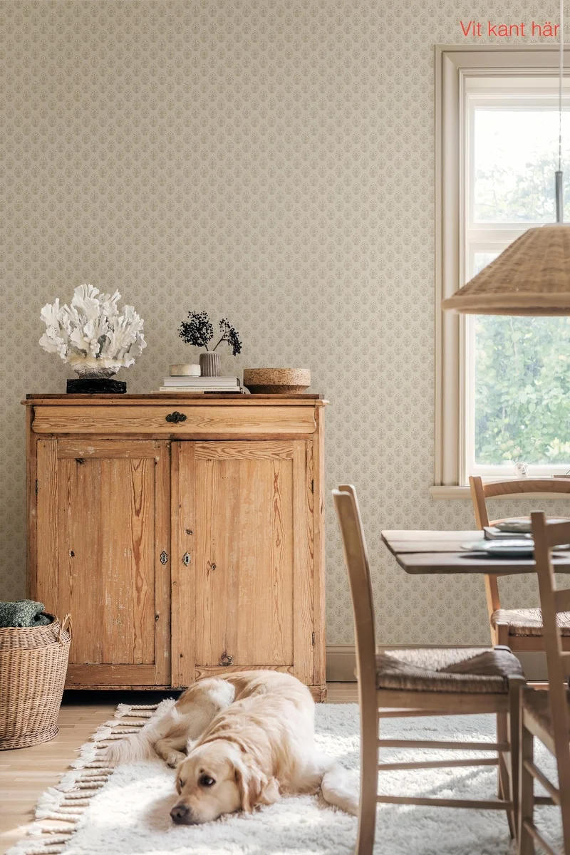 Tapeta Sibylla 8164 marki Boråstapeter pochodzi z kolekcji Charm. Wzór zaprojektowała Jenny Hahne Gadd, inspirując się tradycyjną techniką druku blokowego, dzięki czemu motyw ma lekko ręcznie malowany charakter i klasyczny styl.
